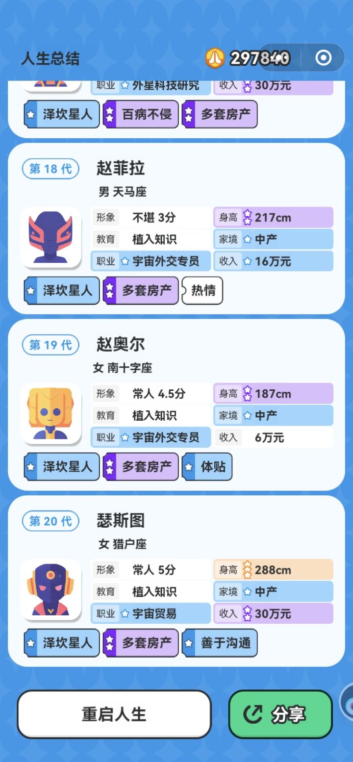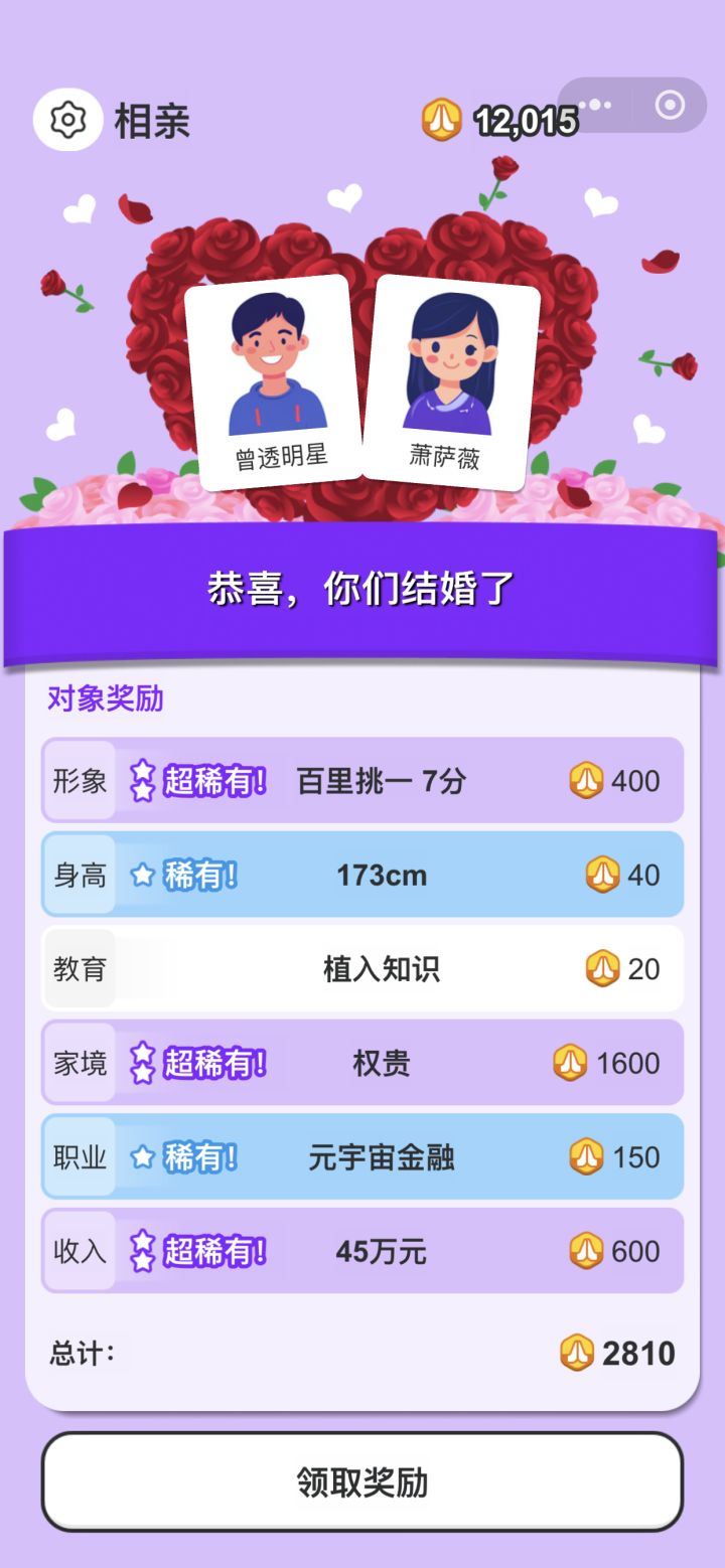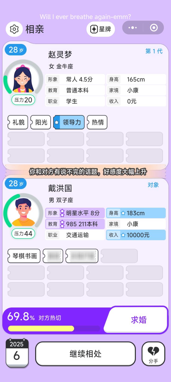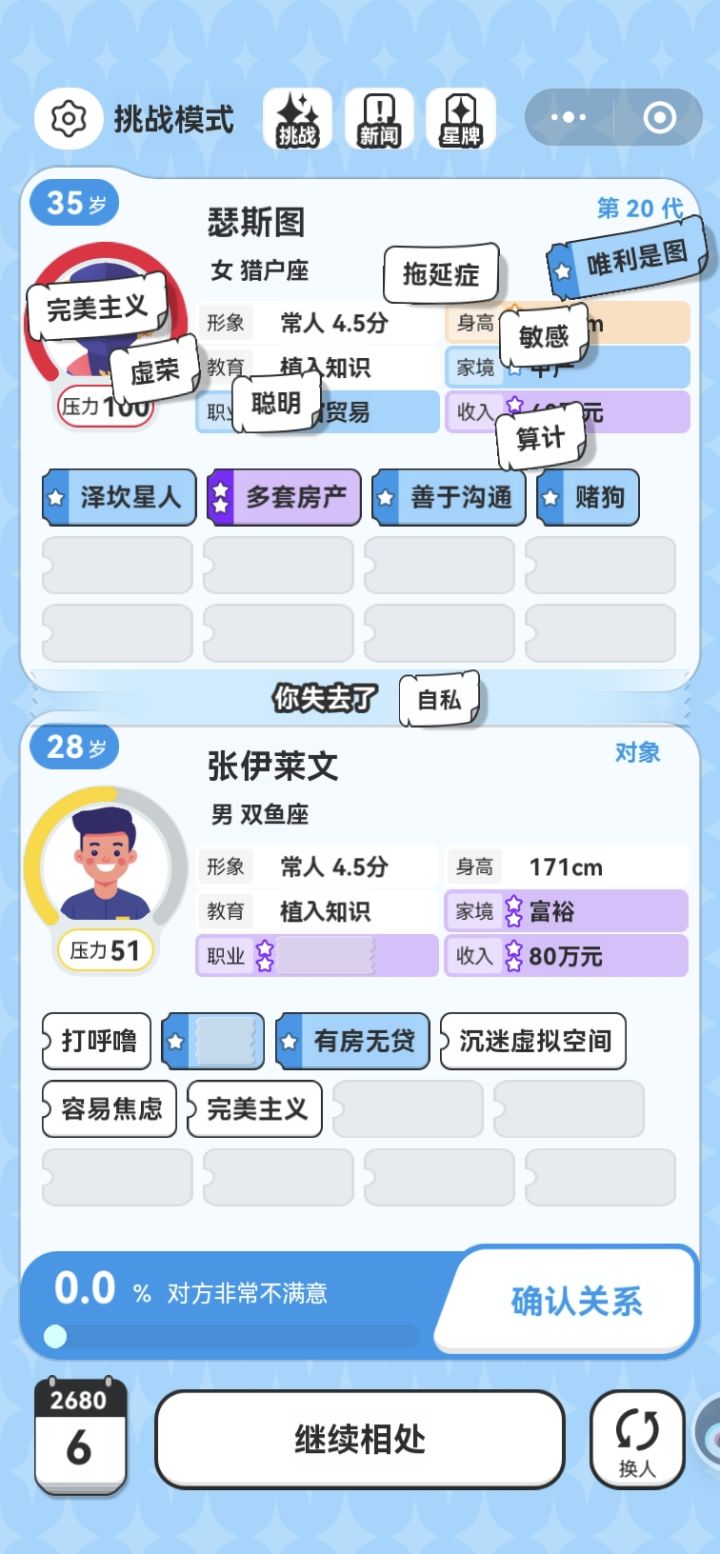 游戏很有新意,也很好玩,第一次玩的时候玩了个通宵,但玩久了体验感有点差,总是莫名其妙被系统制裁,比如这次,数据没啥问题,突然相亲十几个全部好感是0,多相处几次也是失败,一失败还得被贴标签,认认真真玩一局要好久,废半天劲儿结果戛然而止草草结束真的很不爽。。一次两次也就当天意难违了,经常这样真的很消磨玩家的热情😒