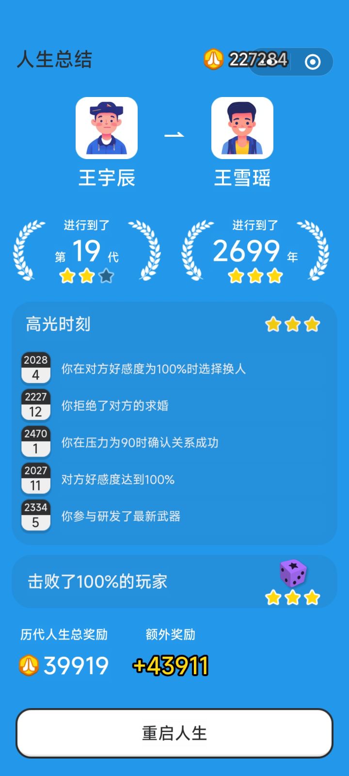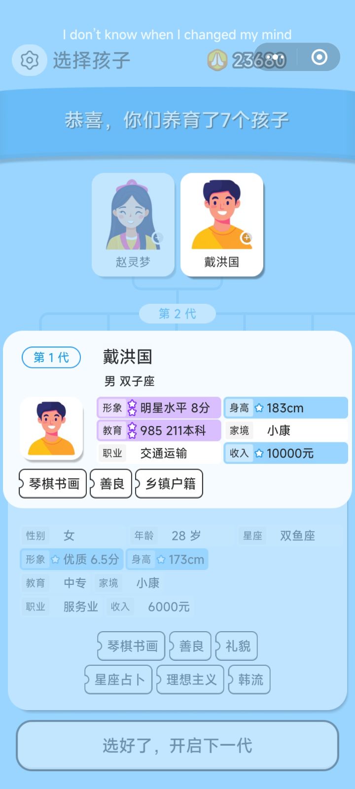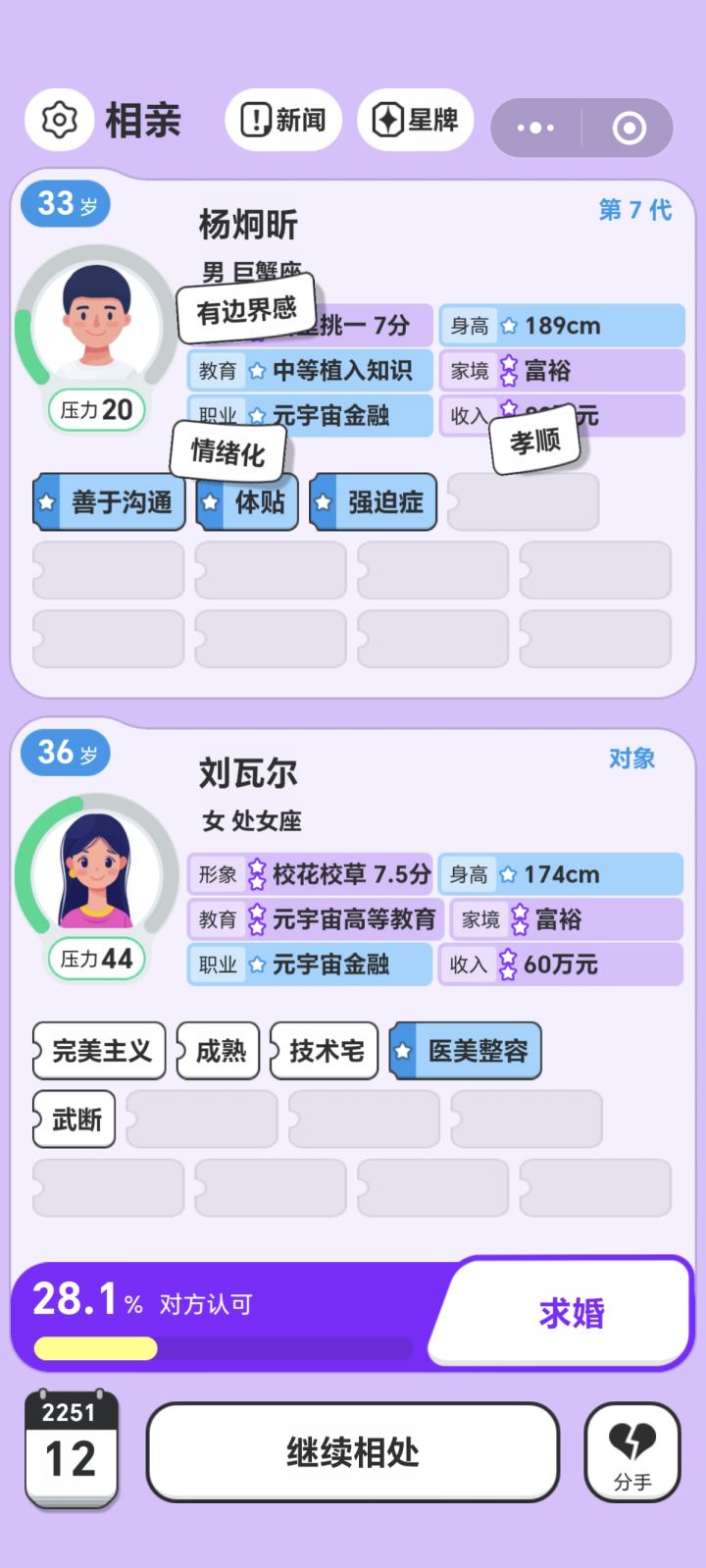 希望能改进一下比如三十五岁不能相亲,但下一代一开局就四十岁了就结束的这种情况😭