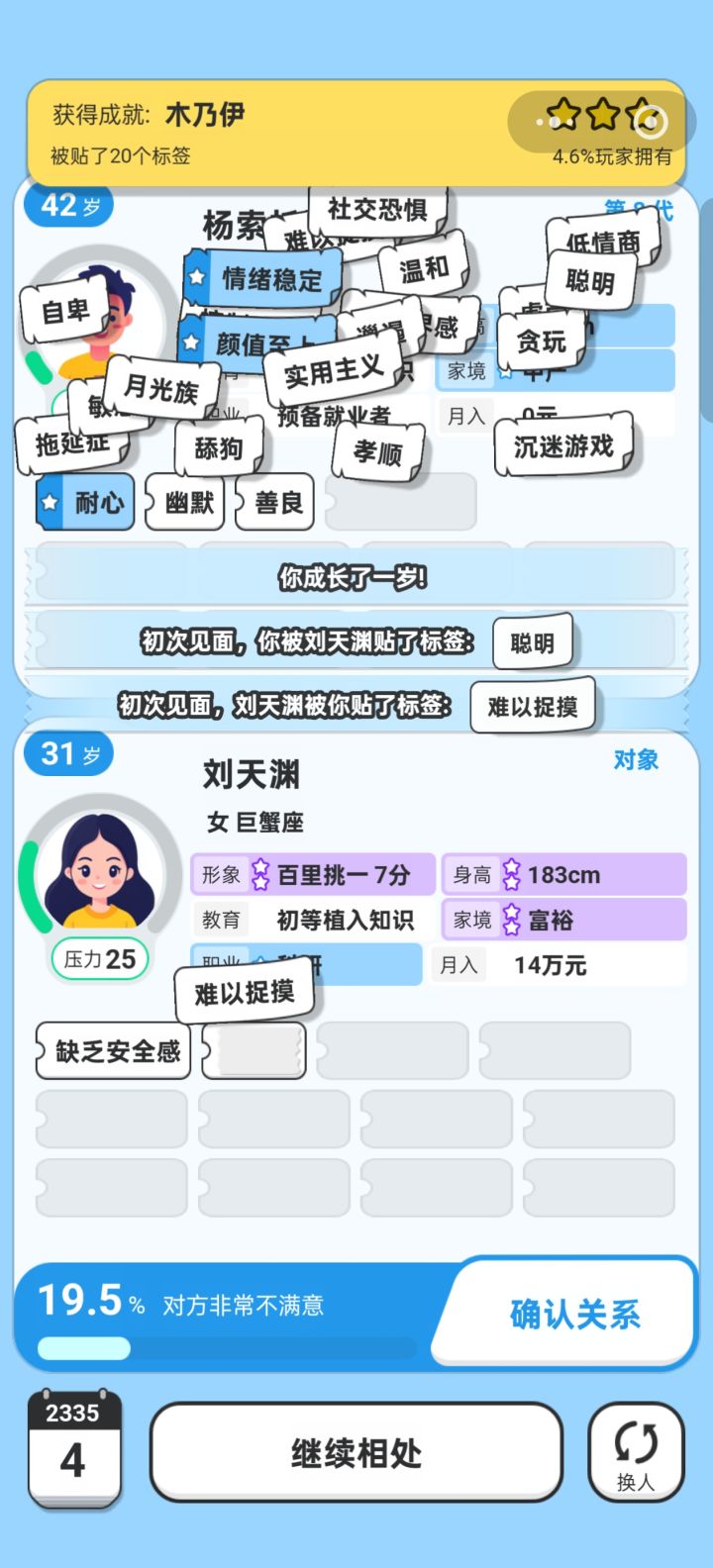 这些标签好离谱,因为新闻是。相亲开始就评价对方结果那么多标结果那么多标签粘在我身上出了个20标签成就这标签看着就好命苦#单机游戏 #纸上谈亲 #非酋的一天