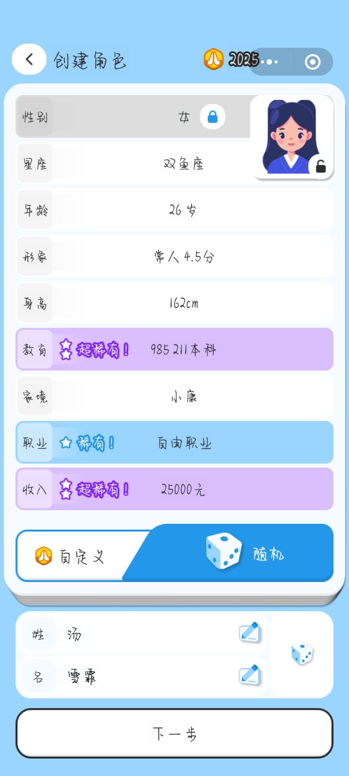 🚩游戏类型:休闲、模拟、恋爱、轻度roguelike🌋游戏介绍:这是一个相亲市场模拟器,你可以定制你的角色,然后投入相亲市场,这里没有玩家与纸片人的甜甜恋爱,也没有普通人逆袭豪门的美梦,有的只是残酷的条件对比与议价,只是人与人之间的互相贴标签。尽量去找一个优质的对象吧,这样你的下一代才能遗传更好的条件!💥感兴趣的小伙伴可以点击评论区上方的游戏链接【预约】关注,方便第一时间掌握游戏测试相关资讯动