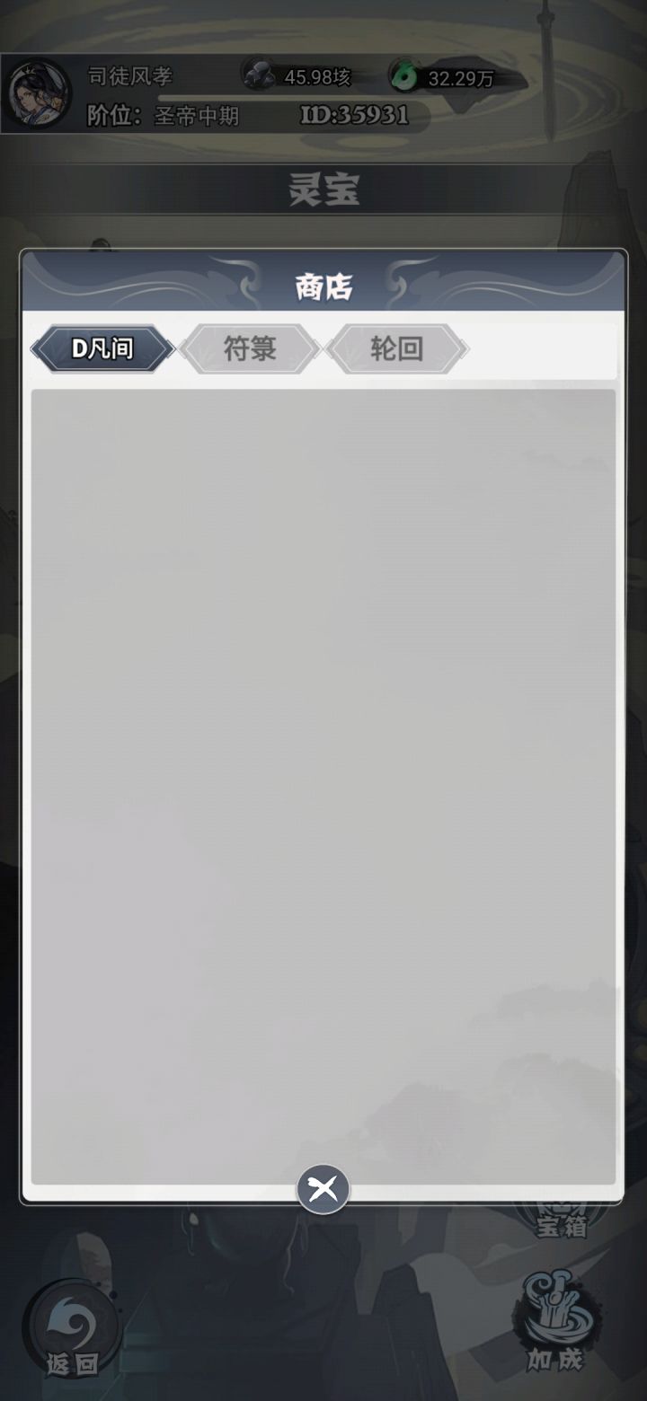 2。灵宝界面的商城空了,货币刷出来再多,没法兑换宝箱也没用。