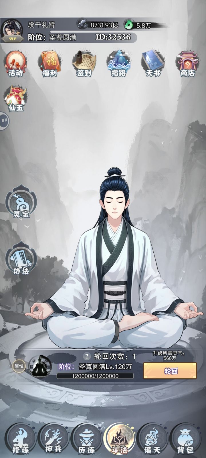 开局先把各个功能该提升的都提升下面进入正篇1、功法先提升二阶最后两个档次,只激活和提升这两档。功法副本不用每天去获取收益,时间攒起来,最好是等刷到五万层再去获取。平时没事多打打几天就满了,根据轮回等级开放五万层以后的2、灵宝优先提升灵石,因为消耗少收益高。等身上的灵石有多了再来提升一键升级。3、【第一次轮回】的时候要注意【先攒灵气】再进行轮回,不然会出现经验不足,提升不到对应的等级不上不下