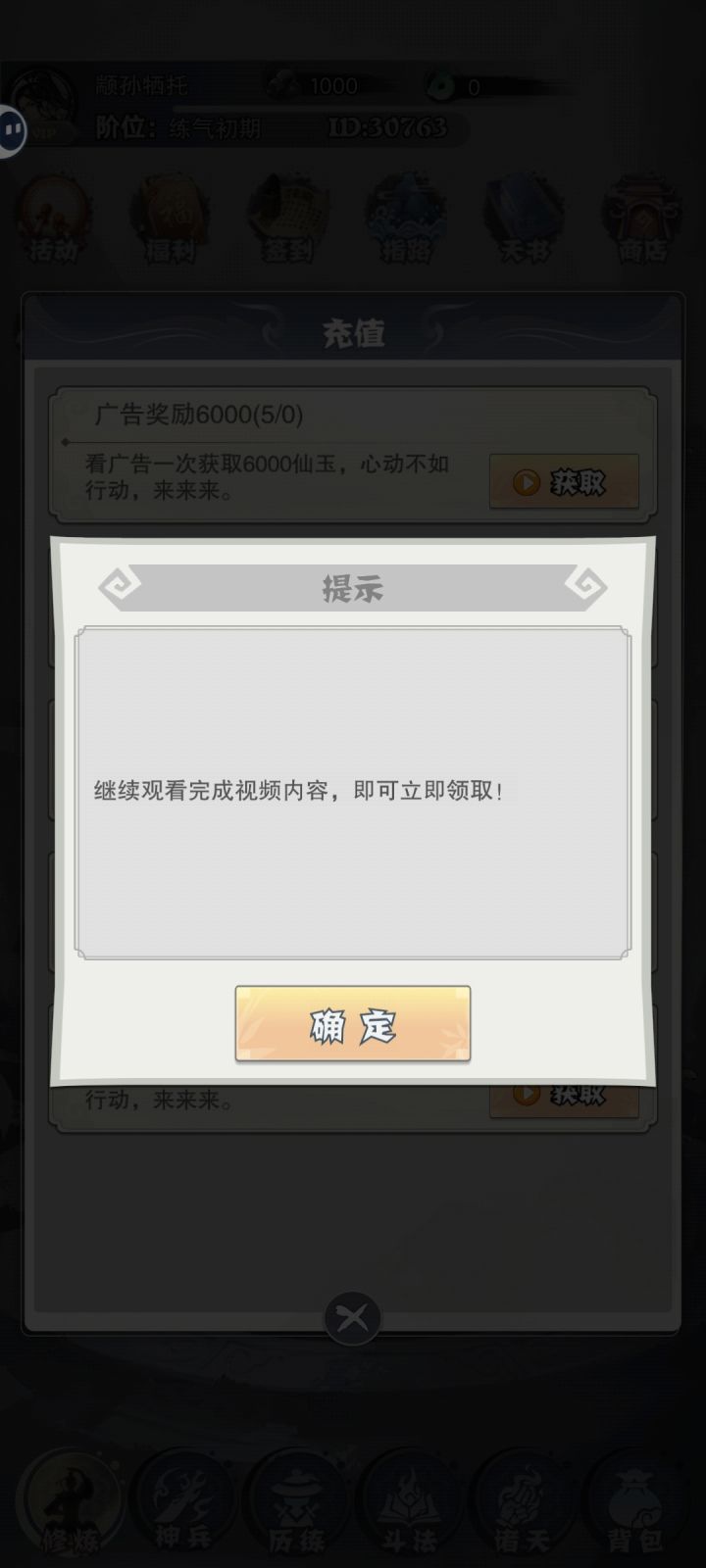 游戏无充值,每天10几个广告给仙玉。仙玉主要货币,看广告给积分,提升vip,Vip提升功法使用上限,建议每天看满。仙玉用来购买各种卡,优先通行证 。获得的神兵宝箱开完,一边开一边提升等级,每天的强化石买到买不起,各种加速卡同理,灵宝副本左上角挑选你打的过的打,功法提升很大,每天记得开完。图鉴需要打镇妖塔给的天梯碎片在灵宝商城买,各种商城里面买的了的也是记得买完!