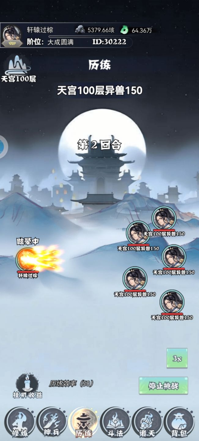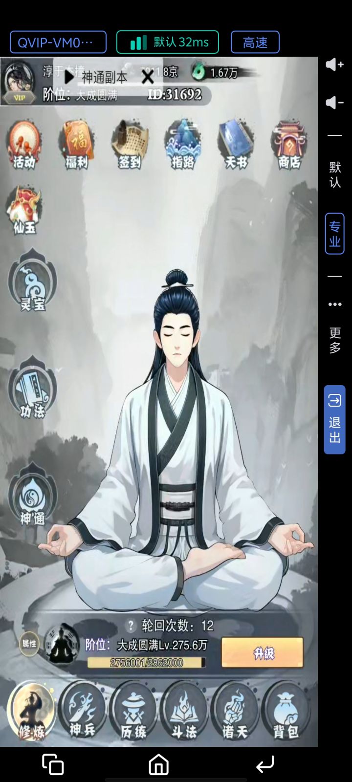 功能介绍及攻略1、仙玉:相当于点券,用于购买战令和加速券。2、VIP:一个广告一点积分,目前上线13级共需积分106,增加功法箱子开启上限以及历练加速卡使用上限,每天看满,大概需要6天。3、神兵:开箱获得神兵装备,提升箱子等级可以提高获取装备品质,品质和等级越高属性越高。4、历练:主线关卡,提升资源获取,尽量打高一天再领取,累计时间无上限,配合灵宝加成。5、排行榜:可有可无,一点宝箱。6