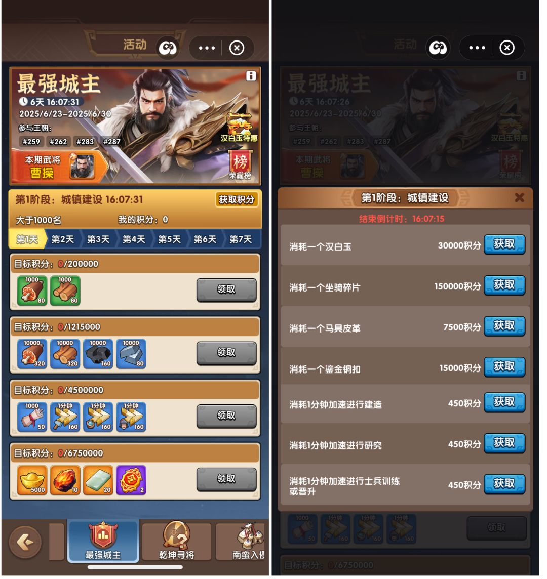 S4赛季开启后第一个活动。 一个赛季共有3次最强城主活动。 最简单: 第1 46 7天 第一天 15000分钟 (250小时, 10天) 第二天:146个传说碎片 (不采集) 第三天训练士兵 第四天 采集 第五天 加速 28000分钟(466.67小时,19天) 或者 840锻造石 (不硬冲) (444分钟,11900分钟,18200分钟,2.8万分钟) 第六天 锻造石 398快 第七天 258传