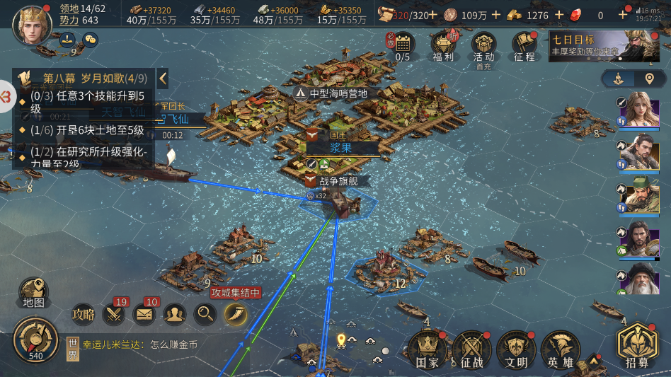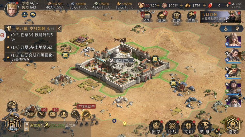 欢迎来到《三国冰河时代》的世界!作为一款策略游戏,对于新手玩家来说,合理规划资源、快速提升实力至关重要。这里有一份新手开荒指南,请各位新人主公查收!在正式讲解开荒攻略之前,这里有一份新手福利指南请查收!第一天如何实现弯道超车,看这里就够啦!1. 前期准备与基础建设(1)资源积累食物、木材、煤矿、铁矿是四大基本资源,通过完成任务、采集资源点和日常活动获得;这些基础资源升级时,一般比例是4:4: