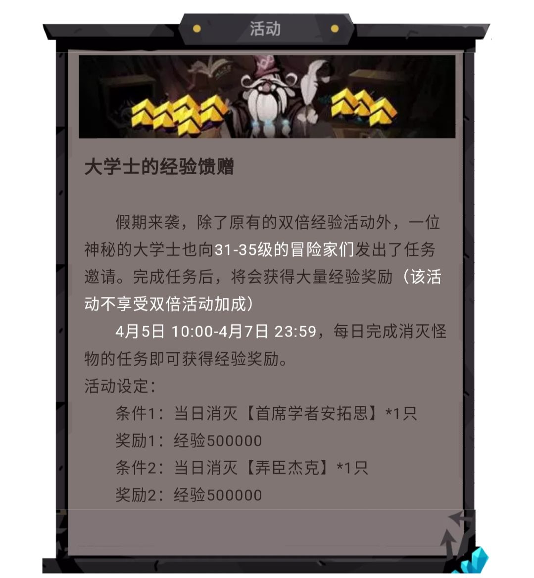 哈喽大家好我是小扁福。 虽然常驻论坛里的大家应该都已经知道了 但是我还得发一波帖子置顶一下 清明节的三天假期,我们为大家追加了一个经验活动,每天100万,3天300万! 【大学士的经验馈赠】 这个活动主要是针对31级到35级的冒险家,这个阶段的冒险家如果只靠日常任务,升级时间还是略微有点长,贪2不应该是一个用等级卡人的游戏,所以我们就又追加了这样一个额外的经验任务。 但是说是“针对31~35级冒险