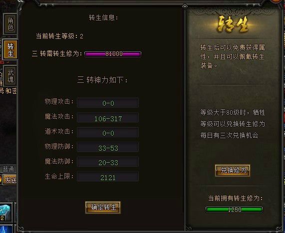 1、游戏角色界面旁边还有一转生按钮 2、当角色达到110级可以点开此按钮,人物转生后可以获得转生属性 3、转生需要消耗修为,角色转生需要消耗转生修为,一转需要10000转生修为,二转需要30000转生修为,即转生次数越多,转生时需要消耗的转生修为也就越高。