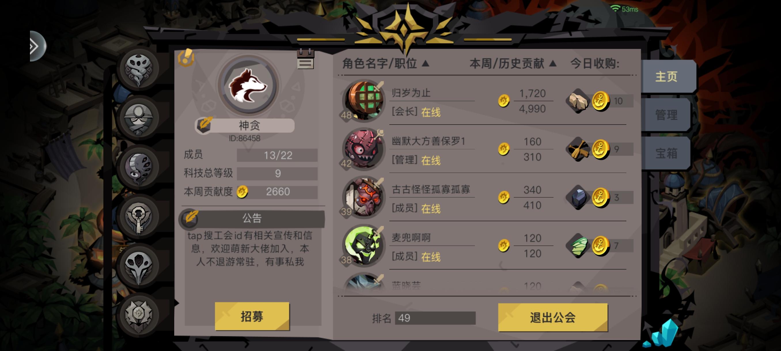 如题,公会id8885,开探险和双倍,周贡6k(保底的周贡,不然开不起双buff😭)