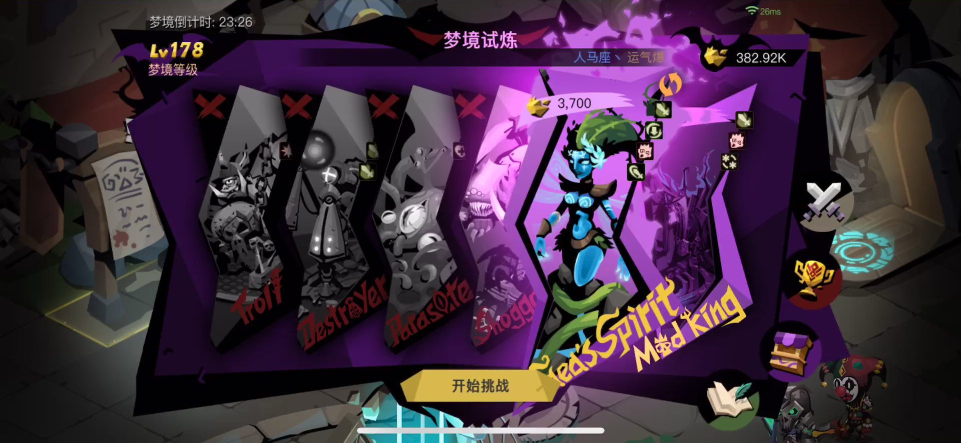 打了50把左右,刷词条(光攻击,传播瘟疫效果,至今也没玩明白瘟疫效果是啥)200水晶,安定花240万金币,80%通过奖励因为根本不可能达成,干脆就没买。还好最后险险的过了,感觉输出有点不够了