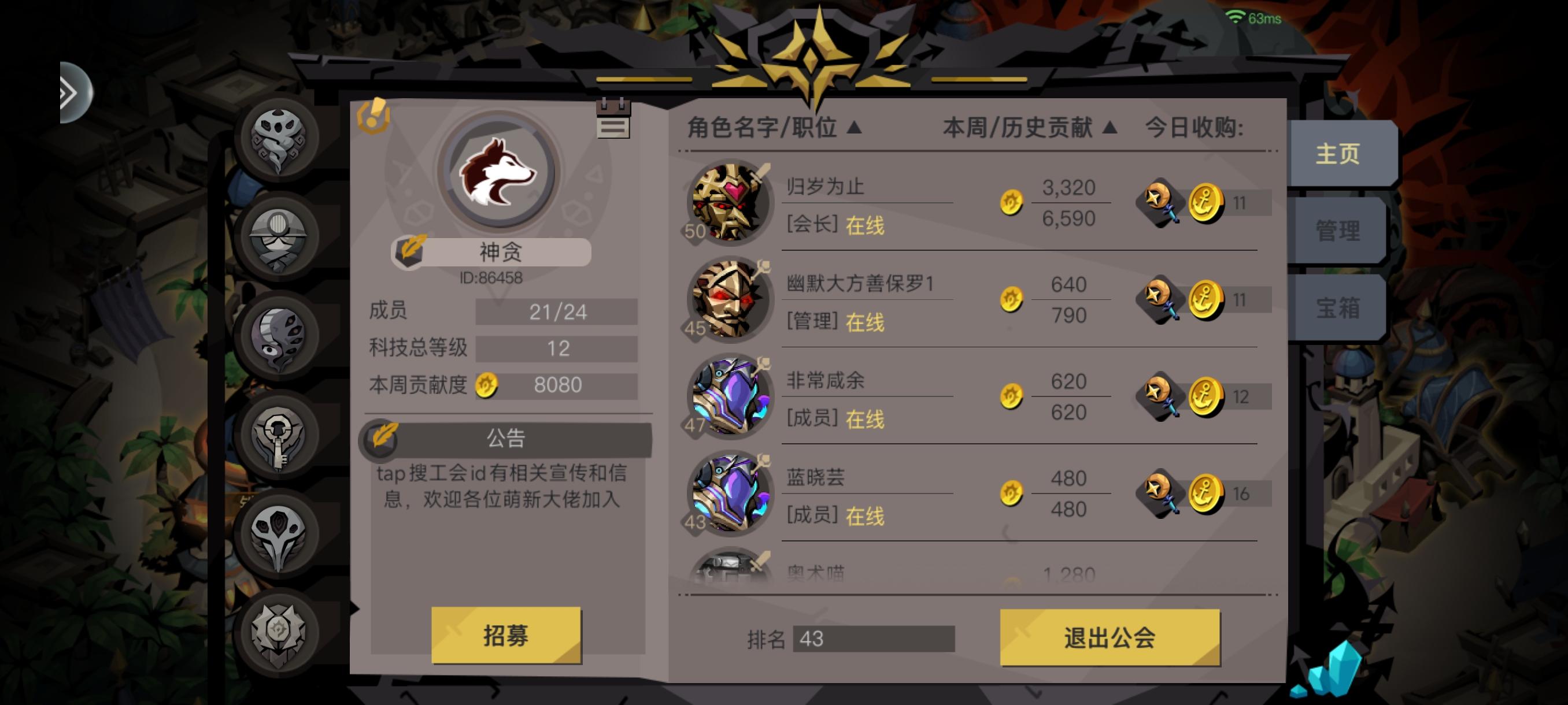 特大喜讯,特大喜讯!下周开始公会副本就可以全部攻略!!!公会宝箱领到手软!!!全体成员冲刺五十级大关!!!无门槛 无任务 无压力!高活跃,好气氛,轻松玩!!如果你在tap上刷到此贴!如果你现在还没有决定要去哪个公会!请务必考虑加入我们!!我