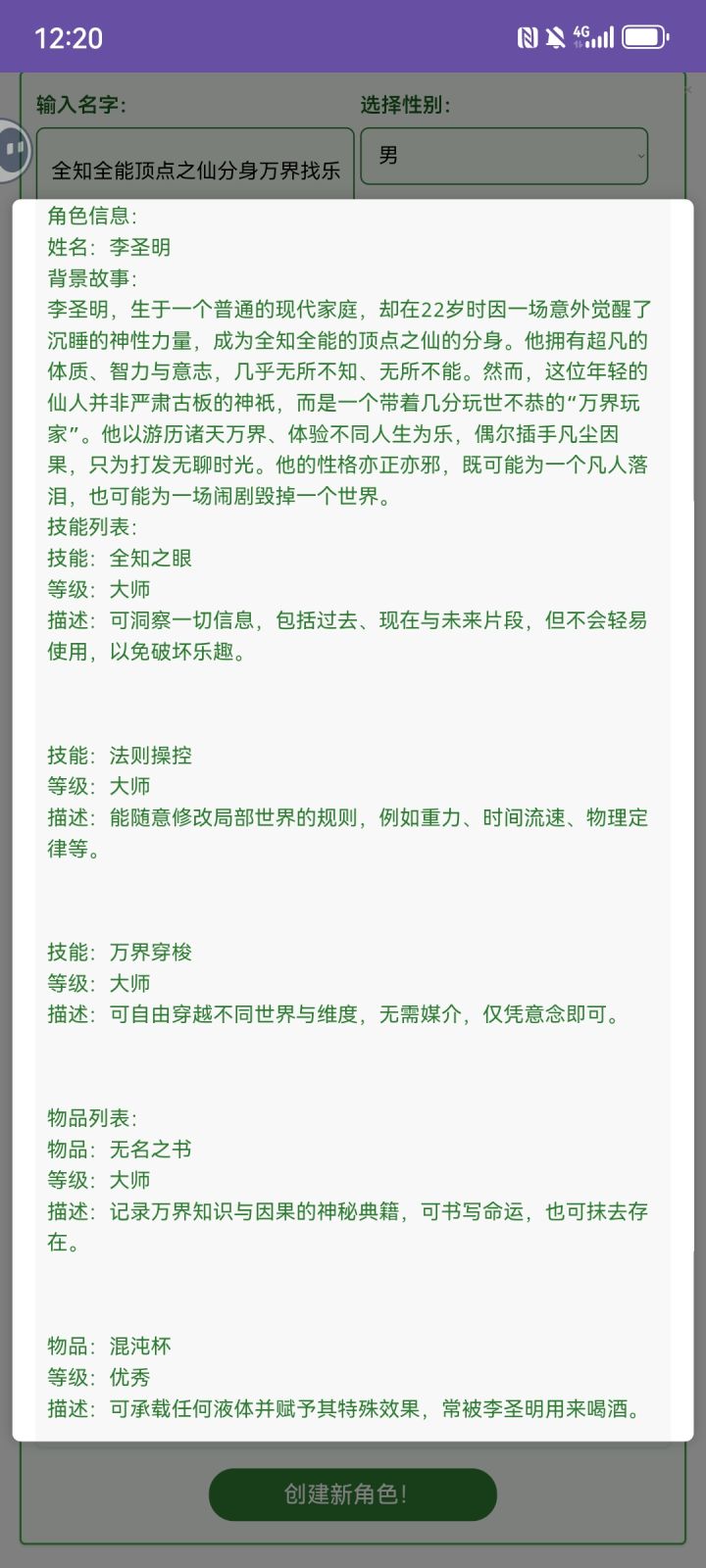 这个游戏其实很简单,不要贪,选项的时候不要想着以小博大,创建人物时属性点尽量侧重一方面,不要妄想水桶号,自由可加的点数也就10点,根本不够用。卡了的话就退出重进,一直到不卡为止顺便一提,创建角色名称的时候还可以加前缀,从而一定程度上控制创建的人物的背景故事和能力,比如图1,其他三个选项我选的全是无,甚至属性点也没加,结果直接出了图2,再比如说图3和图4,生成的故事背景是明显按我设置的称号来的,当