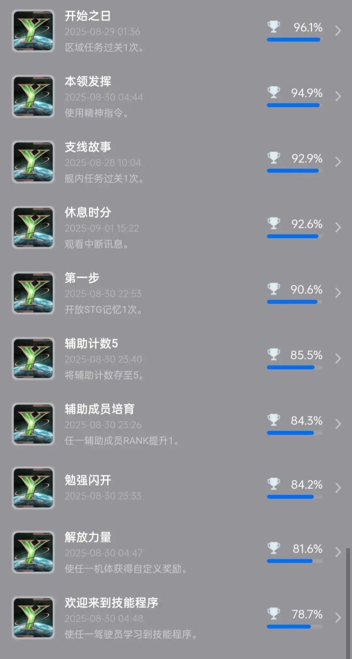 感谢A.C大佬更新全成就心得[原贴为繁体,现已转成简体,对少部分地方进行了补足]这几项应该不用特别解释,按照字面意思去做就好。这里开始获得率比较低的成就(奖杯):寻找遗产-进入第二章才会有遗产任务,遗产任务都是固定等级的解谜任务,过不去可以日后用等级碾压。王牌诞生- 主驾驶员击坠数达到70以上。一机当千- 拿台完改的机体去战线,只出一台开AUTO刷就好。雷电一闪- 找武器有带[反击]标志的