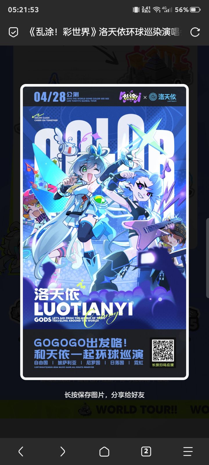 噔噔噔噔!小乐色温馨提醒:洛天依的环球巡染应援活动将于28日0:00结束(明日就是最后一天啦~)天依马上就要来到《乱涂!彩世界》进行环球巡染啦!没有伙伴的荧光棒怎么能行?为天依应援即可获得10张联动抽卡券,邀请好友应援最高再送14抽,伙伴们千万别错过~点击立即前往应援:——神明娘爆涂乱射副副副游——《乱涂!彩世界》全平台预下载将于4月27日00:00开启!▼ 听说点一下会有好运噢:#