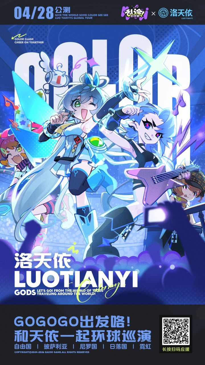 泥嚎,「人」!咿呀哈哈哈哈哈!得知天依环球巡染的消息,小乐色已经举好应援棒,准备和天照一起学习WOTA艺啦~乱涂彩世界×洛天依联动活动428即将开启!小乐色坐在前排观众席,可是拿到了一手联动情报:洛天依又唱又跳?饿坏了连神都要吃?演唱会搞怪颜艺?大战甩葱玉藻姬?噢!小乐色发现还有着超级丰富的福利等待着人!※划重点了,参与洛天依游戏内联动活动总计可免费获得:联动神明娘【洛天依】*6!【
