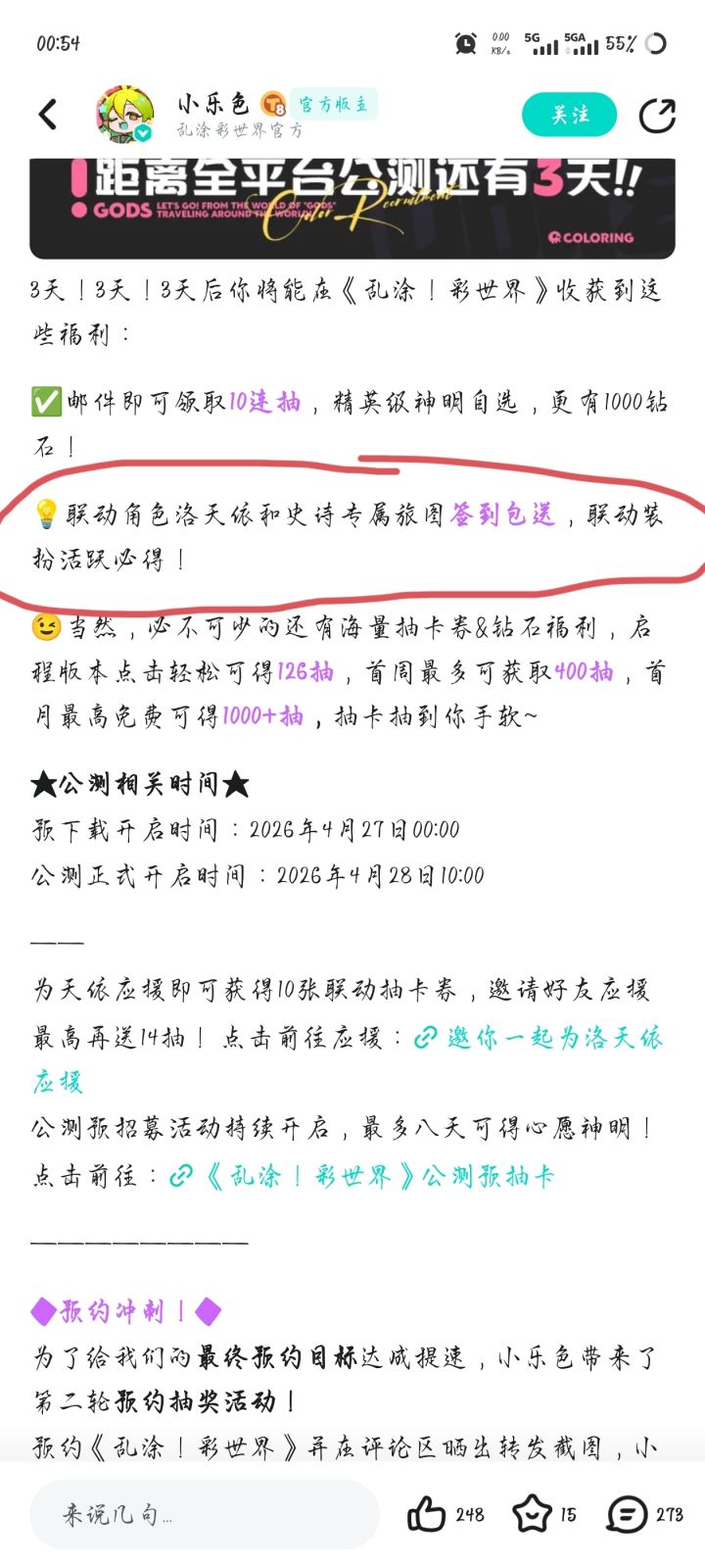 泥嚎,「人!」:《乱涂!彩世界》4月28日公测开启,倒计时5天!★公测相关时间★公测正式开启时间:2026年4月28日10:00来自小乐色的提醒:伙伴记得点击下方链接预约!别忘记准时下载哦~!公测预招募活动持续开启,最多八天可得心愿神明!————————◆预约冲刺!◆为了给我们的最终预约目标达成提速,小乐色带来了第一轮预约抽奖活动!预约《乱涂!彩世界》并在评论区晒出预约截图,小乐