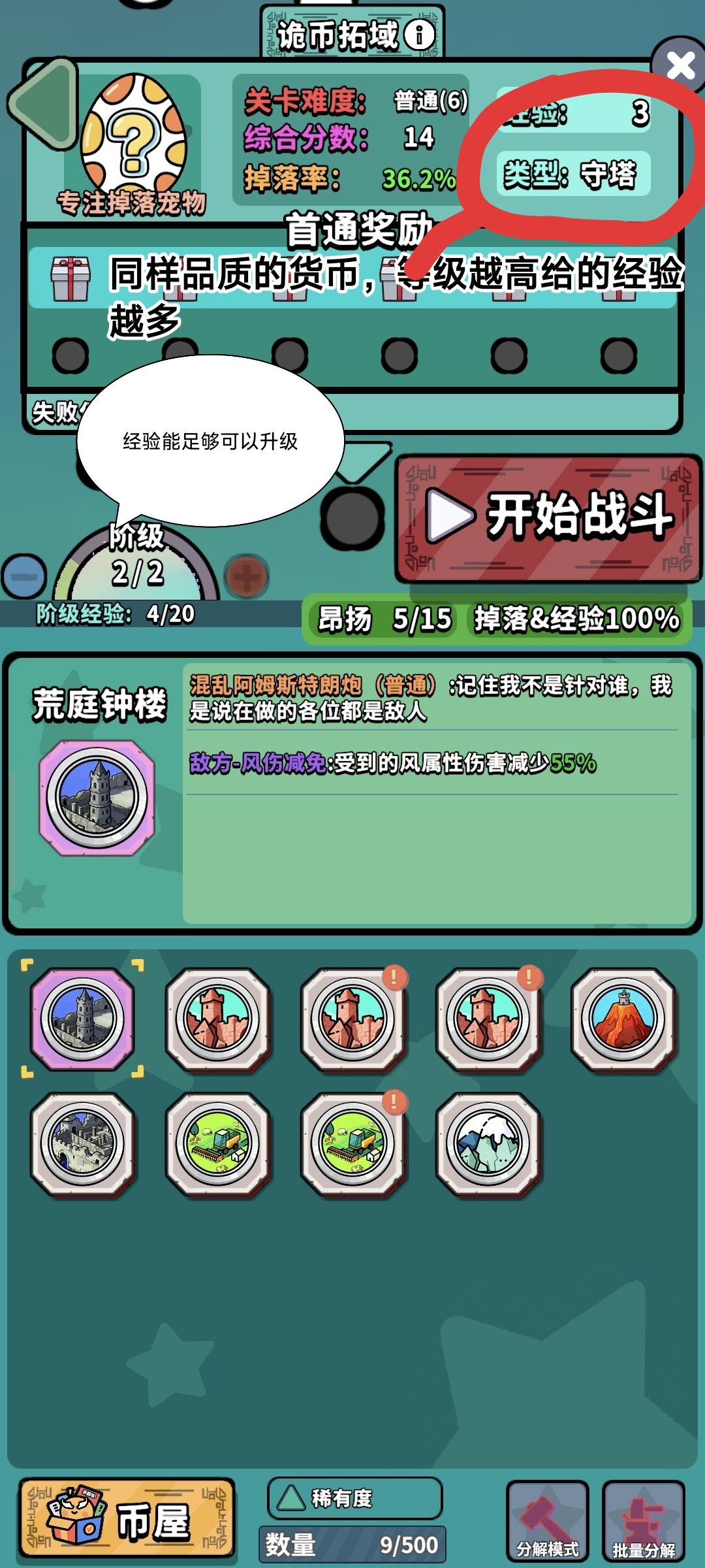 鉴于游戏内给的引导太过简略,我在这儿给大家具体说一下。 1.硬币等级有白,率,紫,黄,红,白色品质最低,红色最高,硬币品质越高,等级相同的情况下给的资源越丰富,等级说明在第二条。 2.游戏有多个等级,目前我见到最高是6级,每个关卡右上角会有说明这一关能获得多少经验,等级越高,硬币品质越高,给的经验也会越高。 3.首通奖励(图三的礼盒)只看硬币品质,不看等级。这个给的东西种类蛮多的,运气好可以获得钻