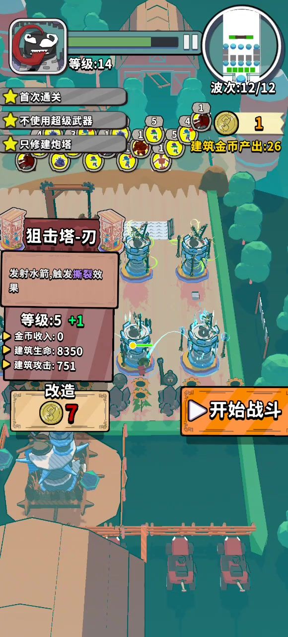 必备词条:风团+风立场 契约推荐:过载-超载 注意细节: ①第二回合直接起3阻击塔即可挂机 ②狙击塔最高5级 ③第三回合开始要留4金币以上方便刷新出有关塔的局内词条。 推荐:3级攻击+3级范围+命令指令 ④局外养成优先财富点出折扣 其次塔点出伤害,最后有多余点出契约+7