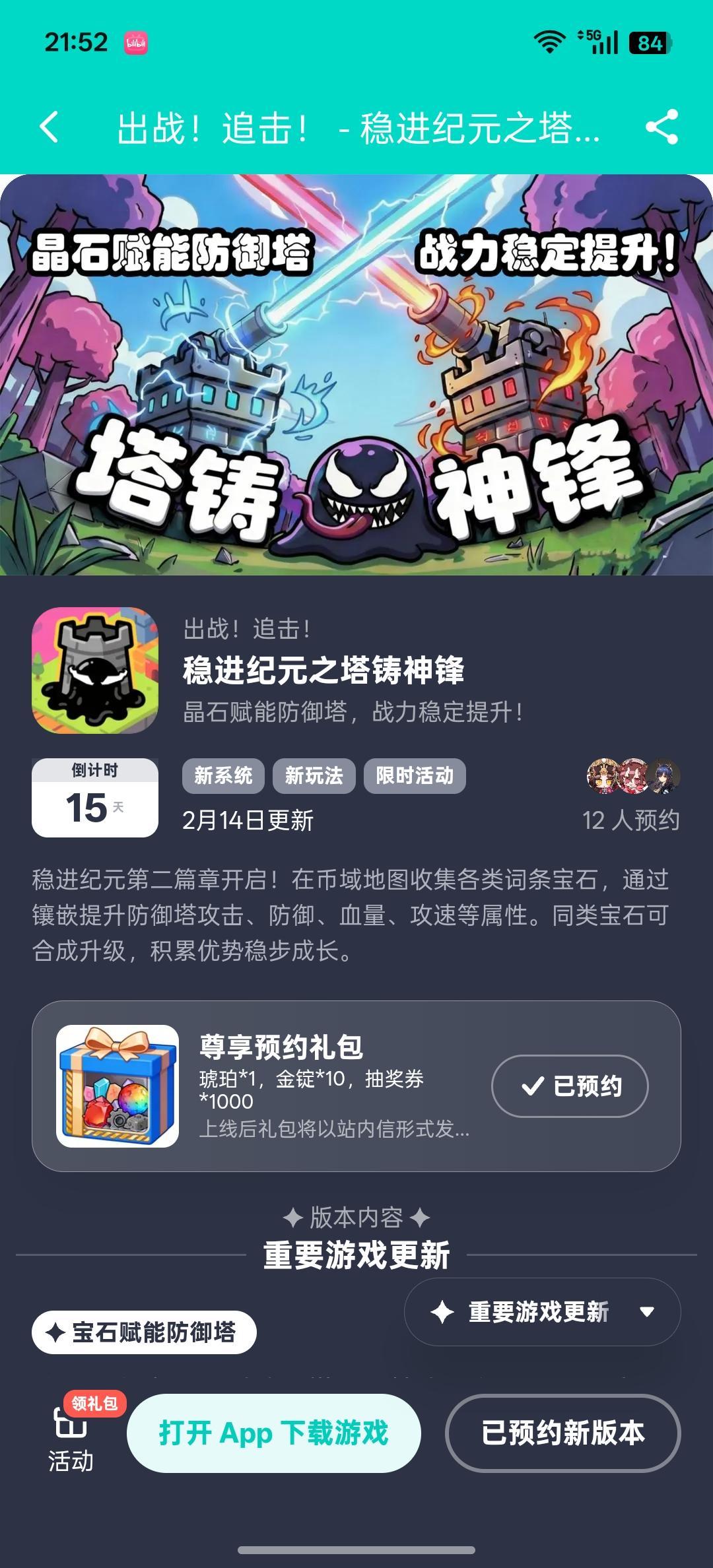 各位老板好, 《出战!追击!》全新大版本——“稳进纪元之塔铸神锋”即将震撼上线!新版本开启后,老板们可以在币域地图收集各类词条宝石,并通过宝石镶嵌提升防御塔攻击、防御、血量、攻速等属性。同类宝石还能合成升级,积累优势实现稳步成长。 为庆祝即将到来的新版本,感谢各位老板一直以来的支持与热爱,除了预约即得的「尊享预约礼包」外,我们还追加了一个新版本预约福利活动,只要参与,即可获得超值游戏礼包!