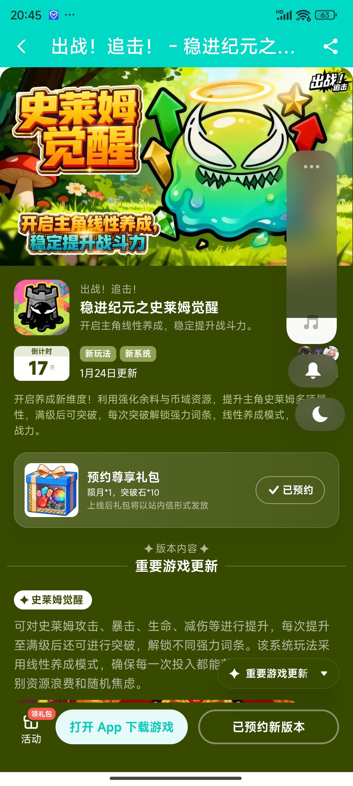 《出战!追击!》即将迎来全新版本——史莱姆觉醒!在这个版本中,主角史莱姆将迎来强化升级,该系统玩法采用线性成长体系,投入资源即可获得稳定的战力提升。主角史莱姆将踏上一条专属的强化之路,带来前所未有的战斗体验提升! 前往预约新版本:https://www.taptap.cn/app/748844/game-event?os=android 预约成功后新版上线将通过taptap站内信获得「预约尊享