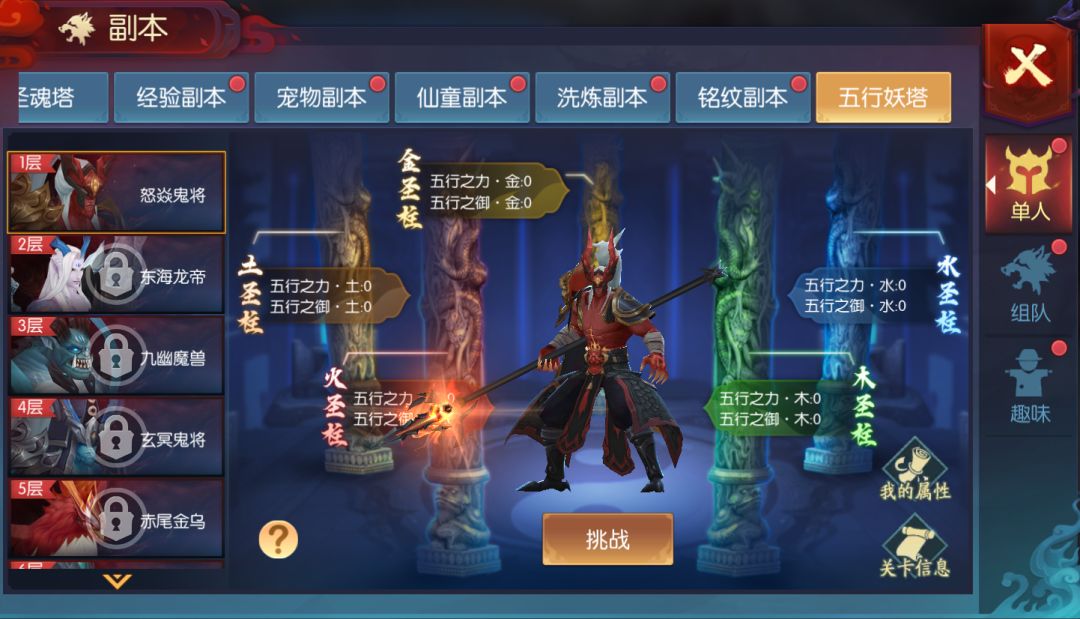 1、五行妖塔为单人挑战,每天挑战次数不限,关卡难度与层数挂钩。 2、每一层关卡由五个圣柱和一个BOSS组成。五圣柱与BOSS分别拥有不同的五行属性,当敌方的五行属性高于挑战者的五行属性时,挑战者的实力会受到一定程度的削弱。挑战者合理培养五行装备能有效提升五行属性,从而轻松战胜敌人。 3、五行圣柱存活时会源源不断给BOSS提供能量,使BOSS处于无敌状态,此时应优先击倒所有圣柱。挑战者摧毁全部圣
