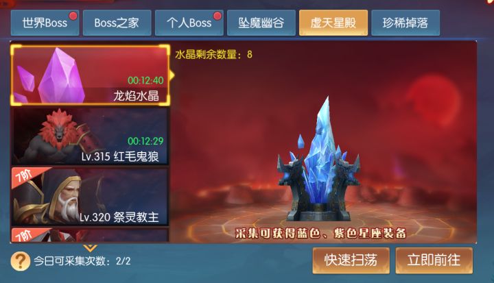 1、每击败Boss将减少归属者1点疲劳值,当疲劳值等于0时,将无法对虚天星殿Boss造成伤害。2、2、每天可采集2次龙焰水晶、可采集10次琉璃晶石。3、每日凌晨5点重置采集次数和Boss疲劳值。