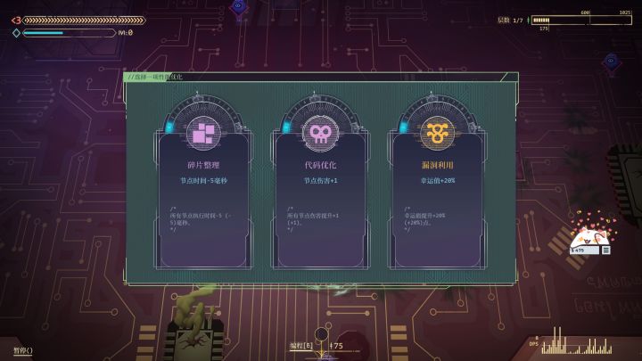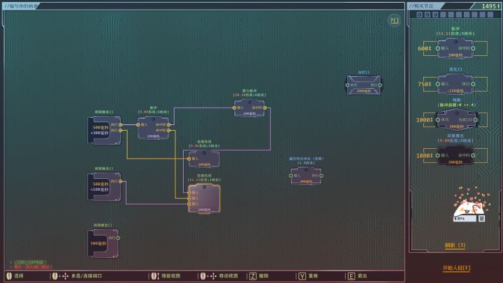 点E可以进入角色的编程界面,在这里主要就是一个可编程的区域,然后右边有售卖的各种模块,在上面坚持到一定时间开启下一层门进入后,也会给一次机会三选一选择模块。