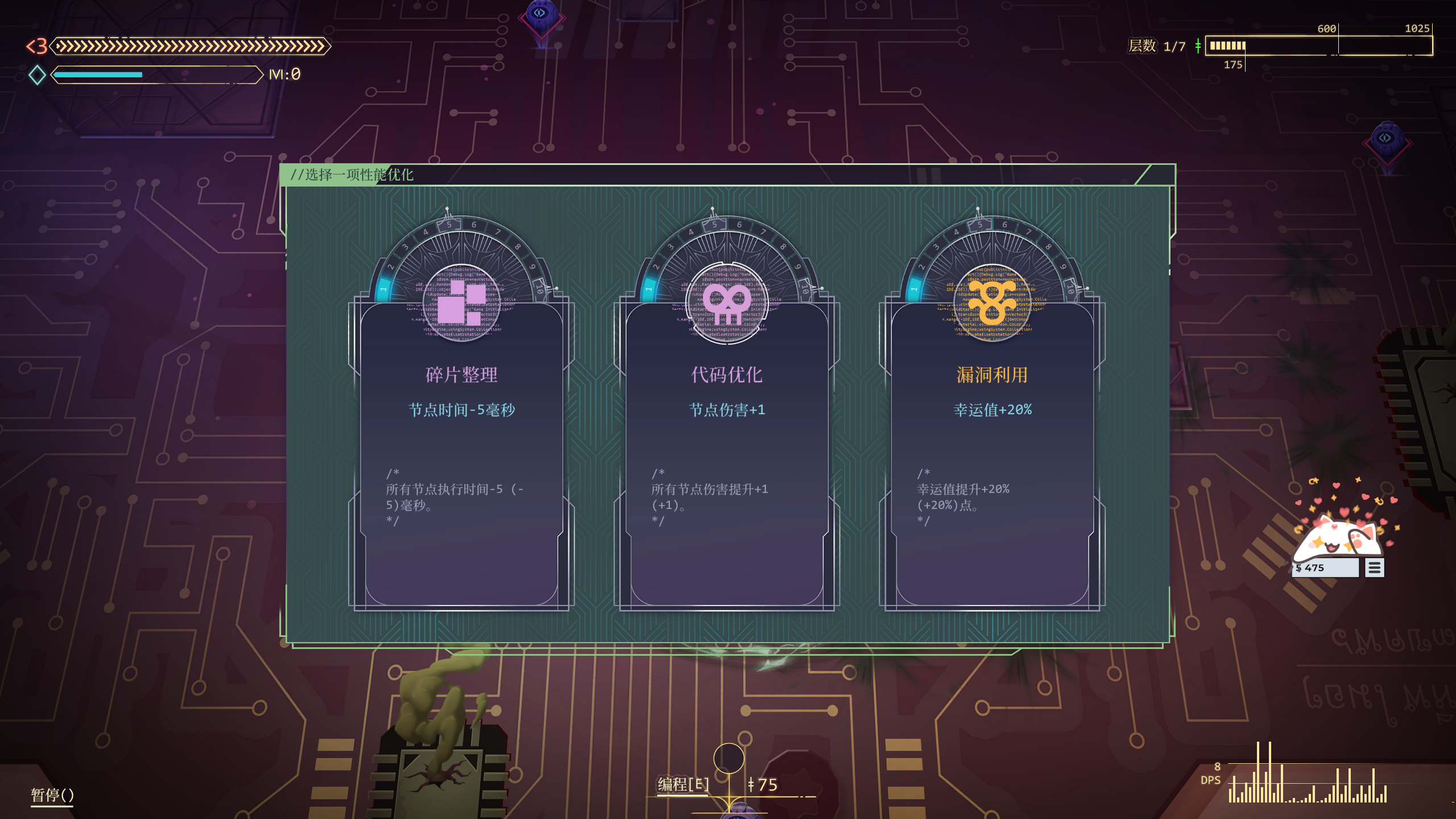 游戏的整体框架是采用幸存者式的,一个大关卡被分为了7层,玩家需要收集在地图上的芯片数据,收集到一定数量才能够进入下一层。收集到数据的同时,会获得代币,代币可以在编程界面购买新的模块。