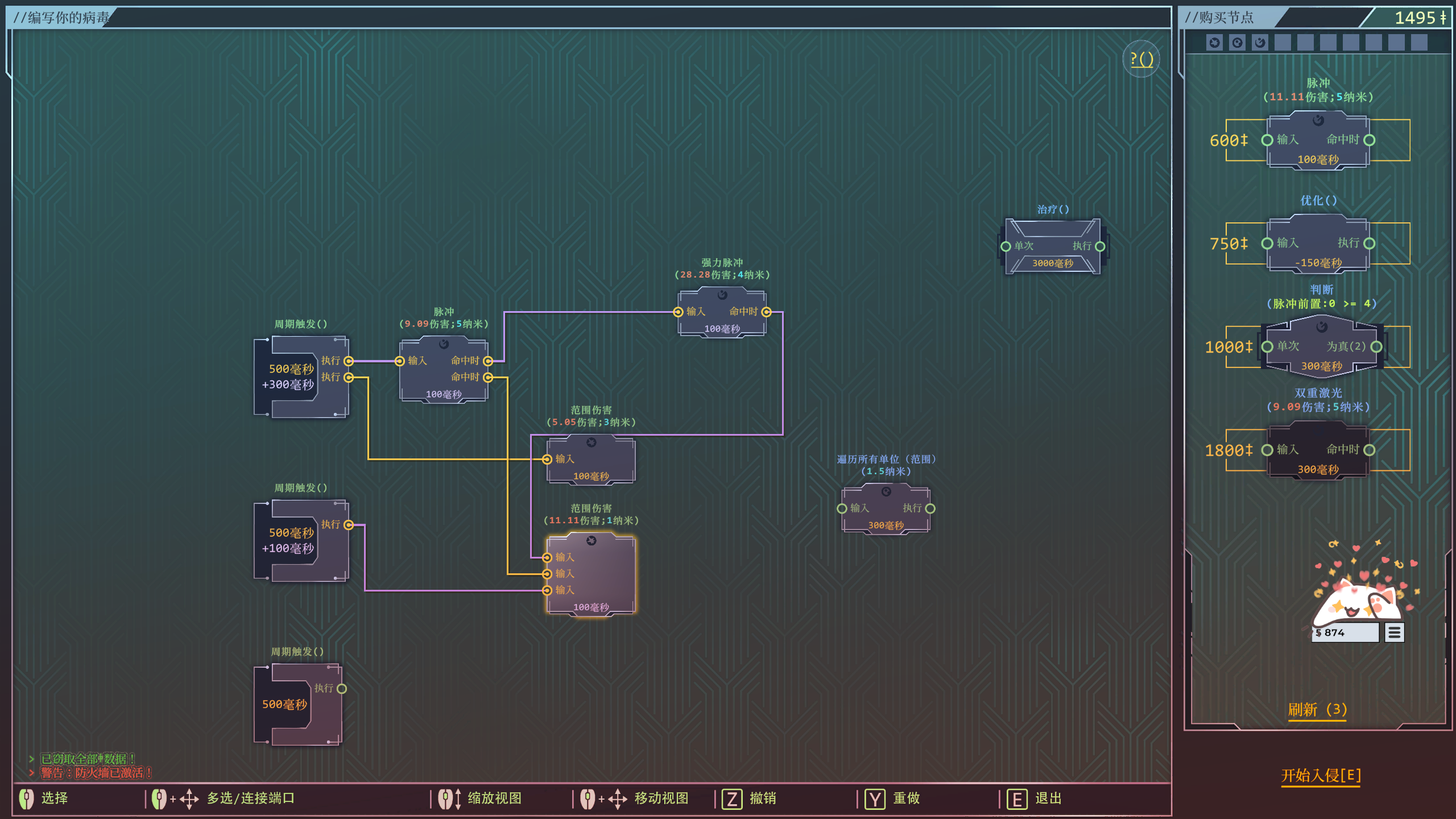 前期开荒可以考虑围绕低CD和多重分裂的模块进行编程,低难度下伤害虽然一般,但攻击频率高,范围广,基本都可以过。之后的高难度则可以在有多个输出节点跟高伤害单节点的情况下,除了增加输出外,也可以在触发器节点的循环中加一个玩家协议。