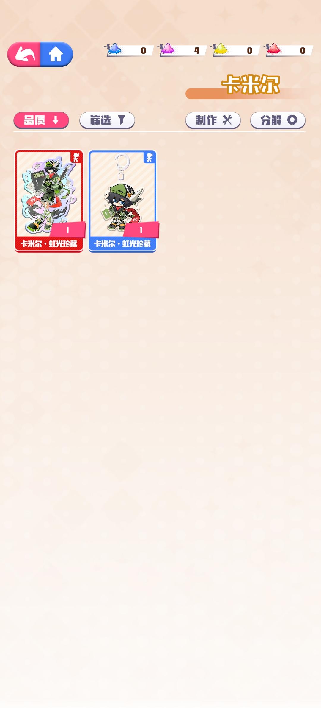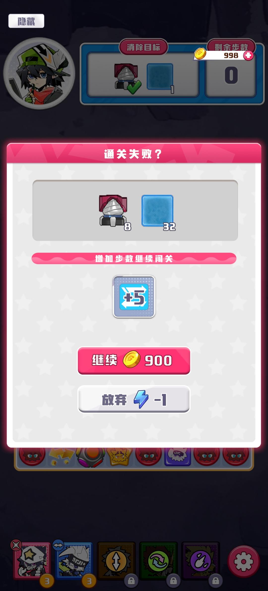 我很幸运抽到了UR卡米尔,但是就没用有但是了因为我不知道卡米尔对我有什么帮助,我只知道我收集到了一只卡米尔,我甚至不能把他摆在主页欣赏。体力溢出问题,你发十点体力非常大方,而我只能拿五点多出来的体力我也不知道被谁贪了。我失败了,只有继续和放弃,我能不能消耗一点体力重来,还是一定要我再次加载。通关后的消除很爽,但就是爽而已,26个金币已经定下来了再什么爽,消除了再多,也是26个金币,没有分数机