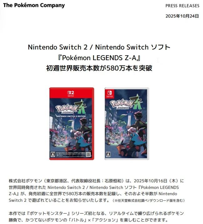 全球首周近600万销量!宝可梦za超神了