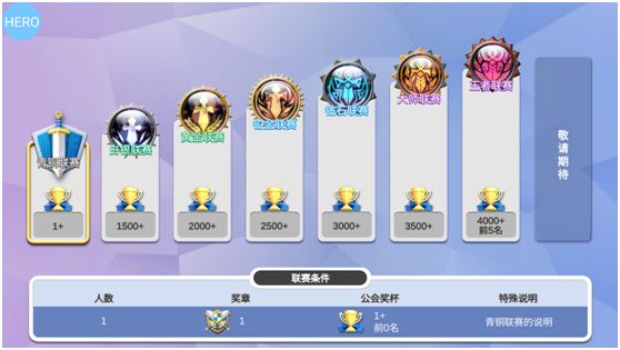 玩具英雄的工会战是一个长期开放的玩法,需要各个公会成员齐心协力,赢取属于你们的最高宝箱联赛规则1.新创立的公会,当奖杯和公会成员数量达到标准,就有机会被青铜联赛录取2.每个联赛有五个公会,联赛赛季结束时,将根据公会在联赛内的锦旗数量排名赢取奖励3.联赛赛季结束后,将根据当时的公会奖杯和公会人数,重新划分联赛4.若公会奖杯进入全球前五名,将被王者联盟录取5.联赛级别越高,奖励越丰厚