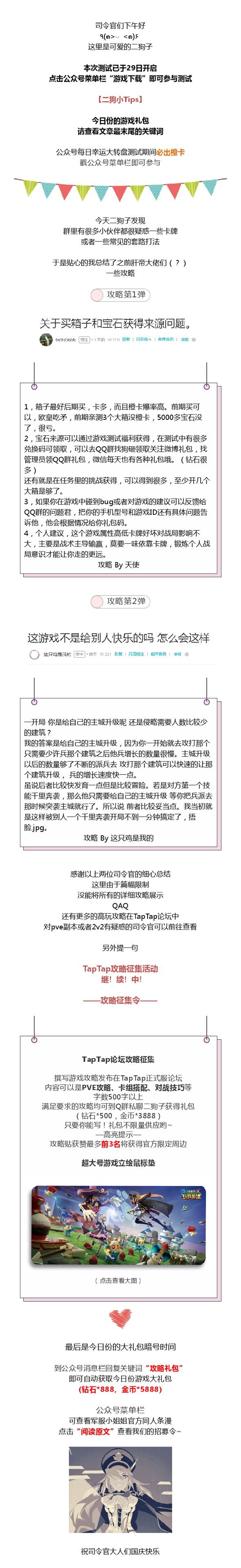 亲爱的司令官们,游戏将于明天上午10点开启测试!这里是可爱的官方人员二狗子为大家准备的一些游戏常见的问题和小贴士,开测前赶紧预习一下吧~1. Q:本次测试将开放多长时间A:2018年9月29日10:00——2018年10月6日11:002. Q:本次测试类型?A:本次测试为不计费删档测试,玩家无需进行付费同时在测试结束后会对所有玩家数据进行删档处理。3. Q:礼包兑换功能在哪?A:主