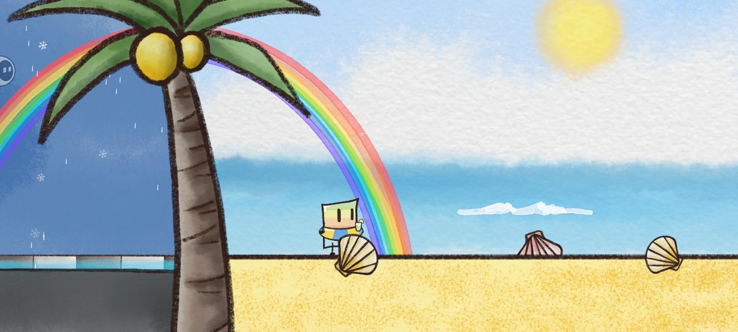 最后有一个惊喜是来了一辆从未出现过的大卡车,溅了好多水,就在我以为要失败重新开始时,小纸片人竟然复活了,前方出现了彩虹。这次小纸片人穿上了彩色衣服,他不再带着雨伞,依然勇往直前,他穿过沙滩、戈壁、大雪、森林,见到了从未见过的风景,最后它来到了公交车的终点站,但这次黑板上写着:“别害怕,雨天也很有意思”。