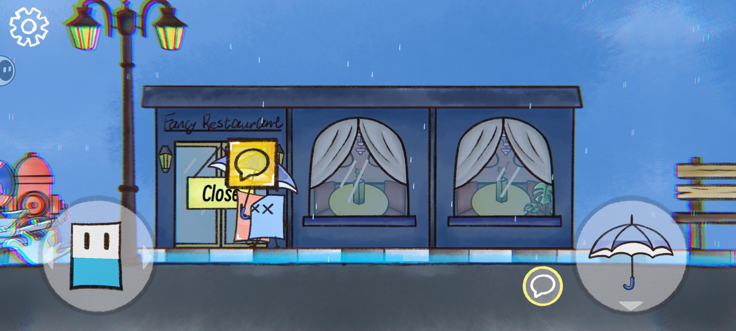 后来我耐下心慢慢玩,小纸片人去了甜品店、书店、水果店、花店、餐厅等,小纸片人进去和屋里面的纸片人交流,也为自己充能来维持自己活下去。书店老板在书里了解到了外面没有雨的世界,说想去外面看看却一拖再拖,从夏天拖到了冬天;织衣服的纸片说:“下雨的天气对我们来说也太可怕了吧”;只有小纸片勇于冒险,在这个全是雨的情景中坚持下去。森林里也有温暖的木屋,待在里面确实很舒服,但小纸片人满怀着好奇与憧憬,出去探索外面的世界。期间也有关门的店,因为不是每个店都欢迎小纸片人。