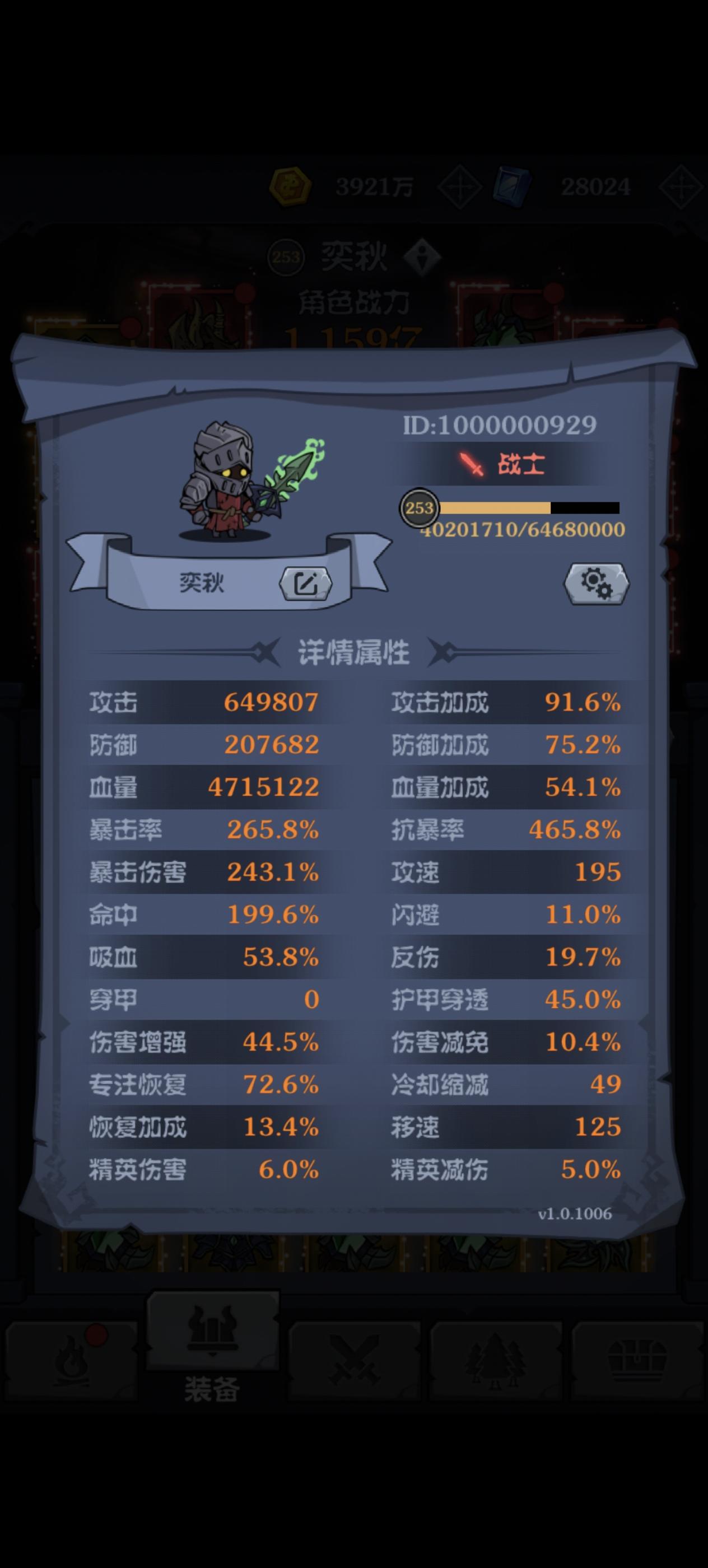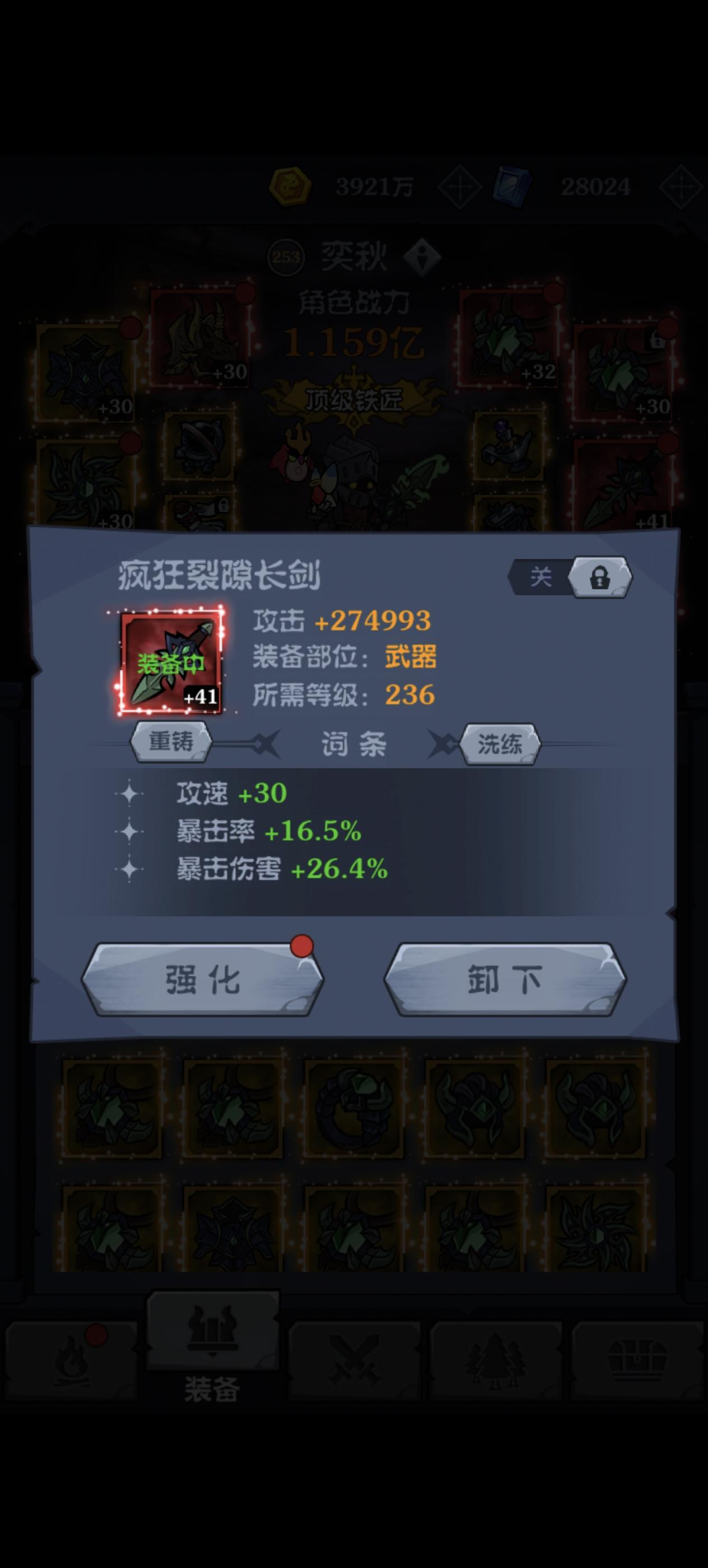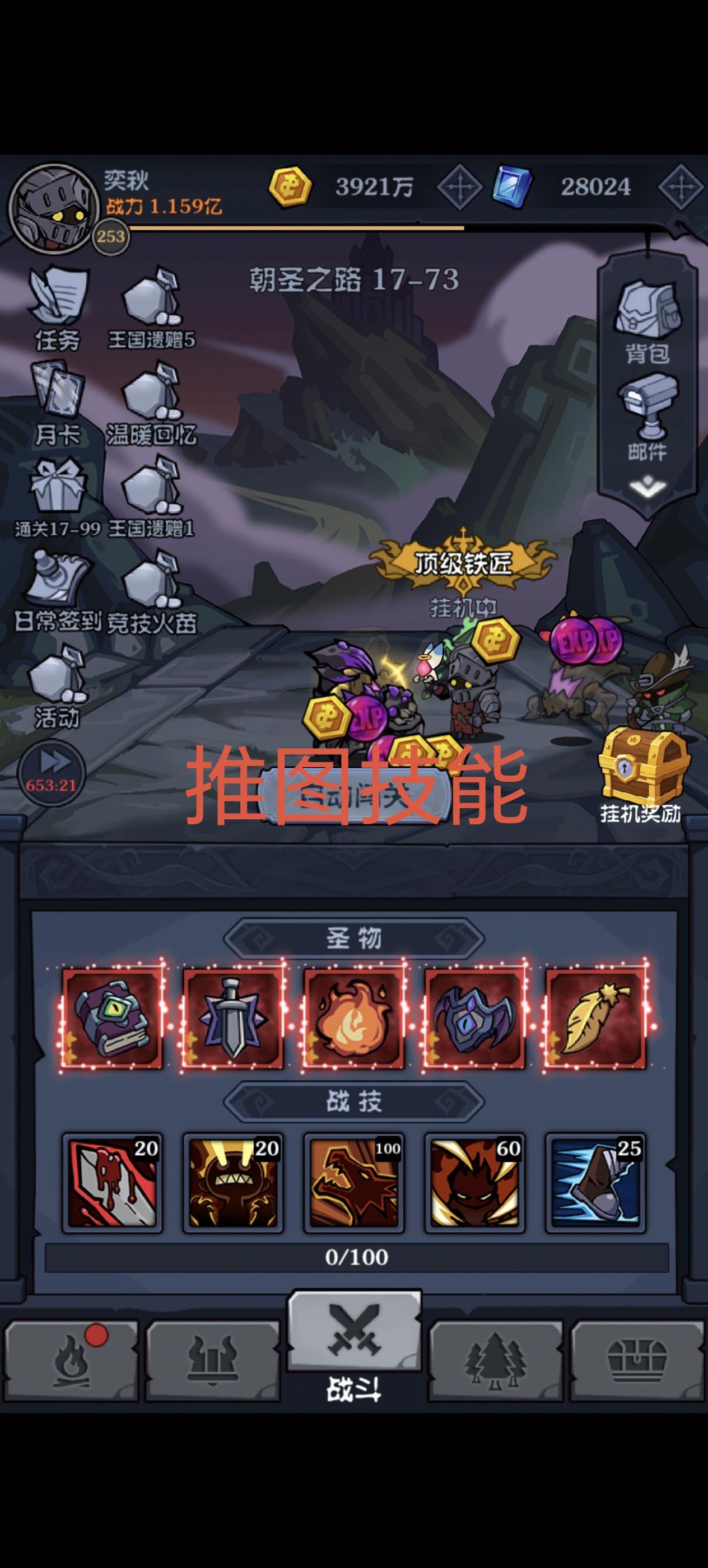 区服:一区 玩家:奕秋 2025年10月21日 (开服第二天晚上)开始玩,历时45天通关16章,开启五阶红装(现阶段毕业装备)兑换,在此谈谈个人心得,欢迎大家一起探讨。一、技能篇。推图、深渊、迷雾用一套技能就行,精英需要换单体技能,具体技能后面会在跟帖里发图。二、圣物篇。圣物基本上一套就够了,详情会在跟帖里发图。三、装备篇。装备分防装跟攻装,装备品质分白、绿、蓝、紫、橙、红,打怪掉