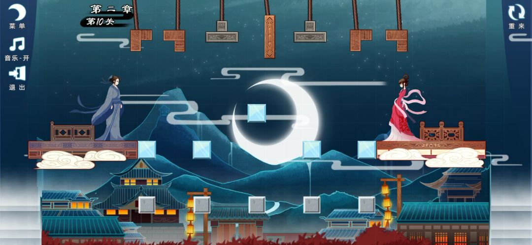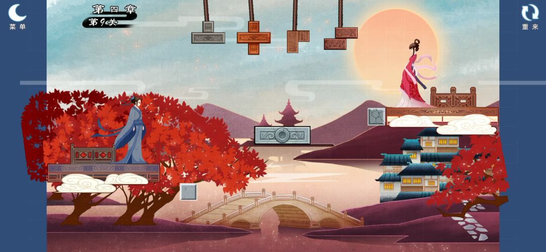 游戏很棒 画面很美 关卡有很多 移动方块时会有喜鹊 就像是喜鹊搭建鹊桥一样 也不怕拿错方块上面有取消方块的区域 结束通关后还会有诗 真的很棒