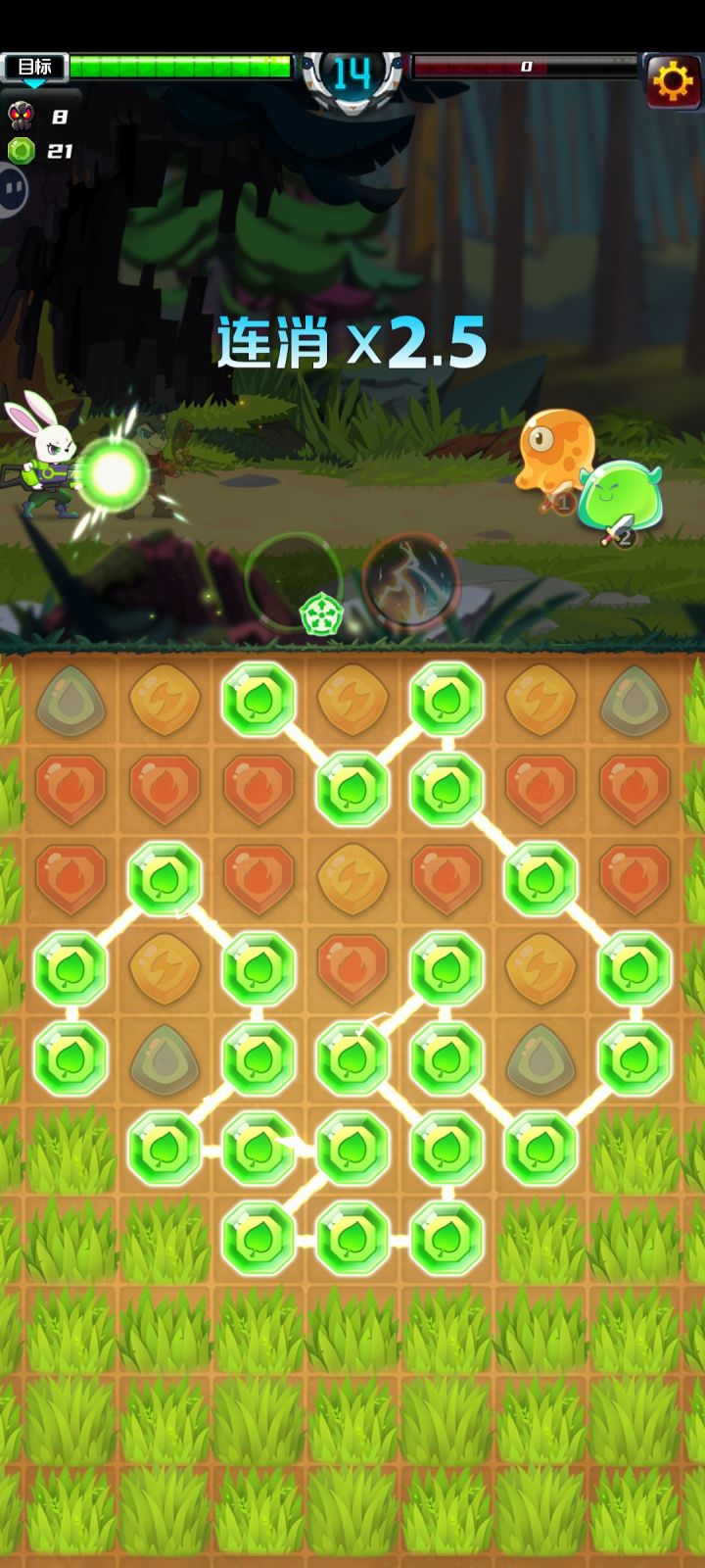 战斗表现较好,连续消除宝石可以直接反馈到攻击次数上,连击的攻击爽感很好。技能特效配合少许震动,有一定打击感。