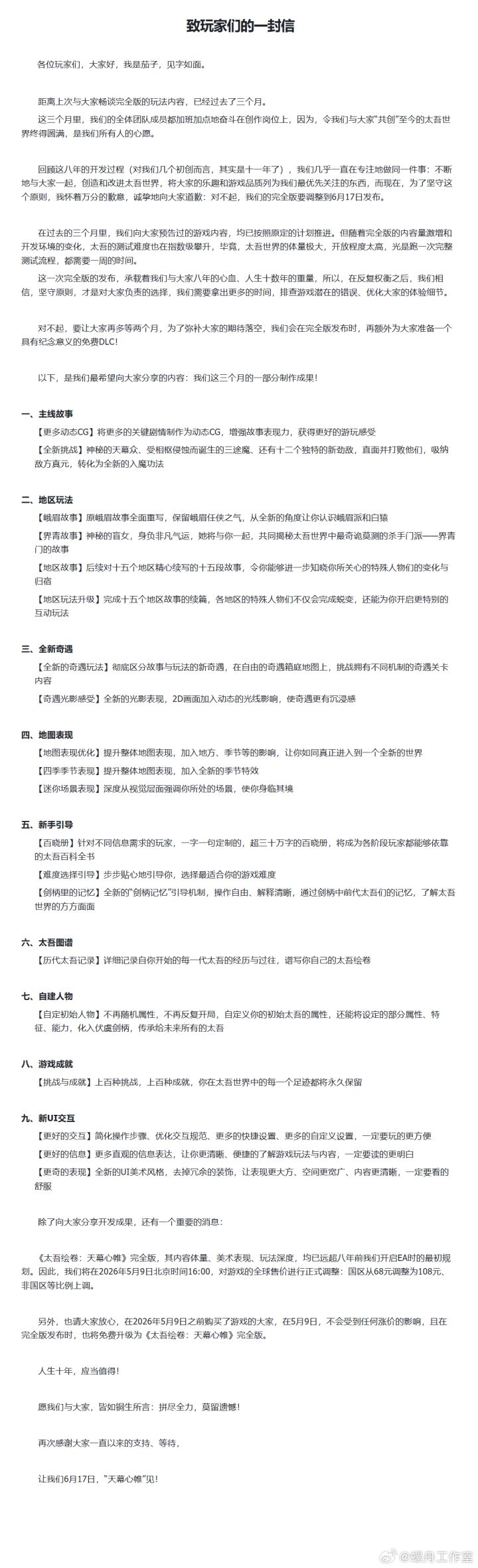 大的来了家人们!近日 太吾绘卷官方宣布,完全版《天幕心帷》延期至6月17日上线,消息一出立刻引发玩家热议。官方表示,这次延期是因为完全版内容、美术、玩法比之前多很多,测试难度变大,想多花时间排查错误、优化体验,还会免费送玩家一款纪念DLC,补偿大家的等待。 同时官方也公布,5月9日游戏将涨价,国区从68元上调至108元。不过福利很明确:5月9日之前购买的玩家,不受涨价影响,完全版上线后还能免
