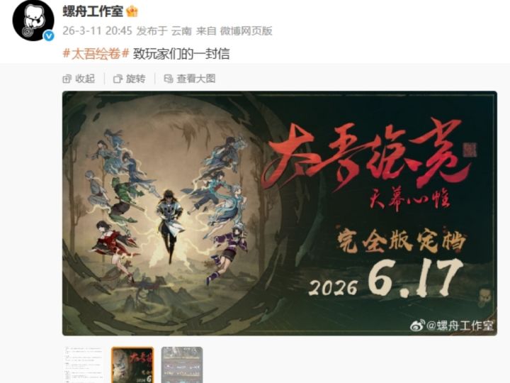 3 月 11 日,螺舟工作室发布了《致玩家们的一封信》,并宣布国产神话武侠题材独立游戏《太吾绘卷:天幕心帷》完全版定档 2026 年 6 月 17 日上线。官方表示,回顾这八年的开发过程(对我们几个初创而言,其实是十一年了),我们几乎一直在专注地做同一件事:不断地与大家一起,创造和改进太吾世界,将大家的乐趣和游戏品质列为我们最优先关注的东西,而现在,为了坚守这个原则,我怀着万分的歉意,诚挚地向大