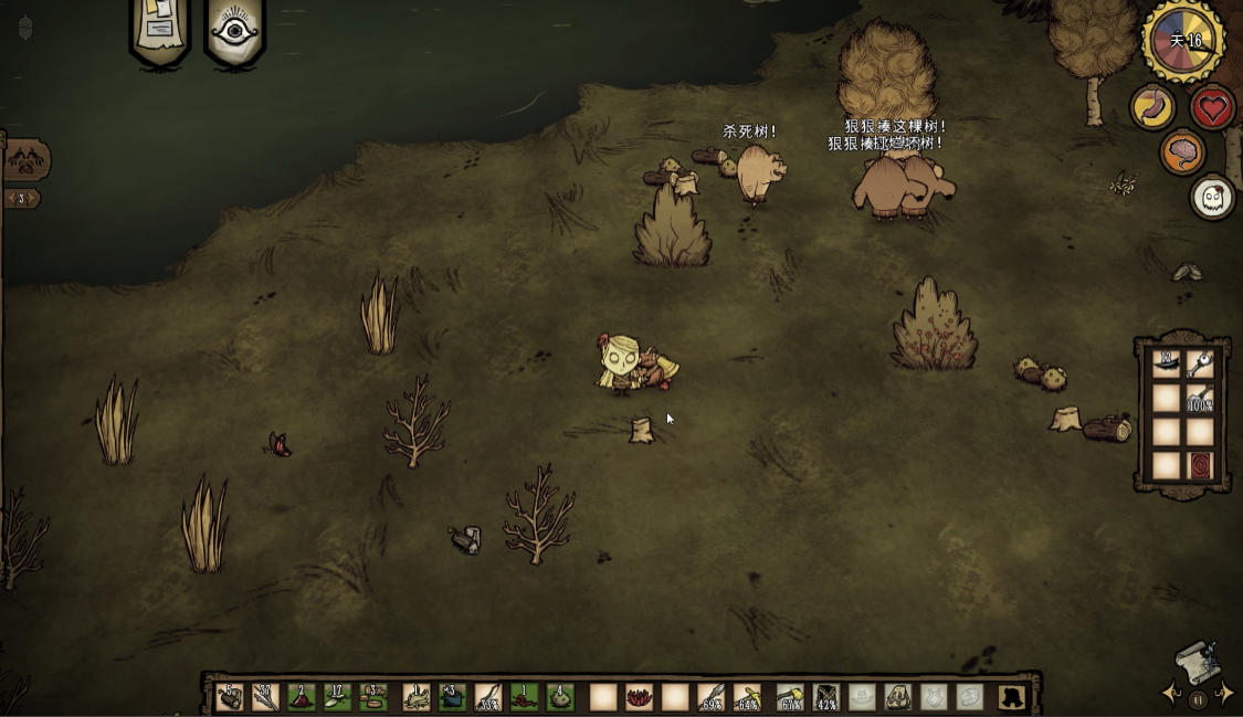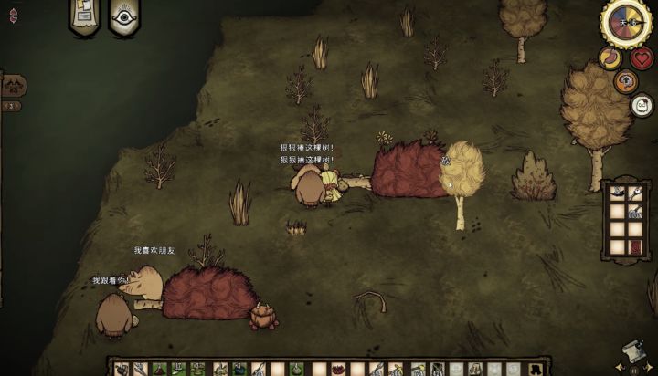 游戏生存太过于过于硬核。也许你听过“如果我们不能改变世界,那就不让世界改变我们。”但在这里通通没有用,你可能死于偷高鸟蛋走位不太灵活;下雨天怀疑自己是否有脑残(san)值而死,嗯,第一次看见脑子不够会死;夜晚迟迟点上火抽烟郁郁而终,我呸,是被查理偷袭而死。但游戏并非故意不让玩家存活,游戏存在一套完整的生存法则,boss来临会有提示音,种子引鸟,给猪人吃肉招募,吃四块怪物肉会暴走,以及十天左右的猎狗群殴和来年春天的青蛙雨。熟悉掌握这些规则,你会感觉这是个有逻辑有真实感的世界观。如若你想不从,嘿嘿,那可能是这样的。
