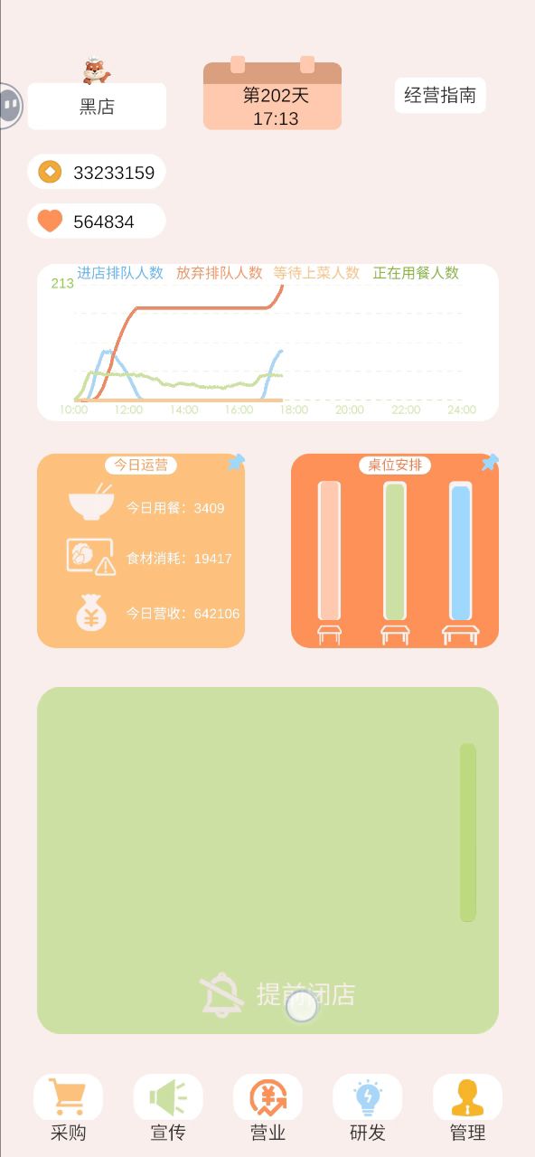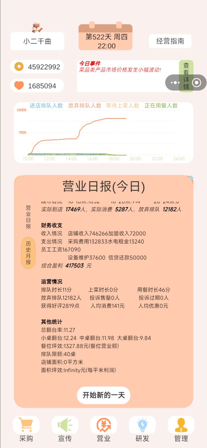 游戏10分钟,十天,营业额≈全部成本,通关速推 ①开局贷款三百万 ②菜品定价价格售卖最高五倍倍利润, ③员工4,8,8,10 ④购买60万的店铺 ⑤桌子30,19,19 ⑥折扣除了最后一个100万宣传不点,其他全点(95折,300减100) ⑦菜品推荐买就行 剩下看一下营业额,营业额约等于成本之后, 留十万, 剩下全部梭哈装饰品 #spacebar