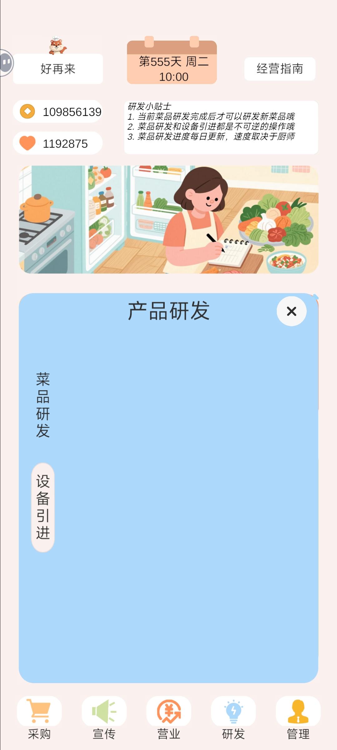 游戏10分钟,十天,营业额≈全部成本,通关速推 ①开局贷款三百万 ②菜品定价价格售卖最高五倍倍利润, ③员工4,8,8,10 ④购买60万的店铺 ⑤桌子30,19,19 ⑥折扣除了最后一个100万宣传不点,其他全点(95折,300减100) ⑦菜品推荐买就行 剩下看一下营业额,营业额约等于成本之后, 留十万, 剩下全部梭哈装饰品 #spacebar
