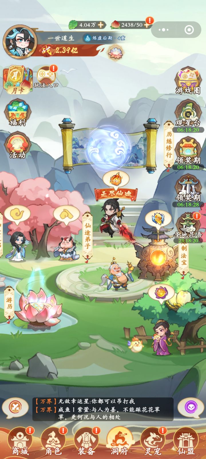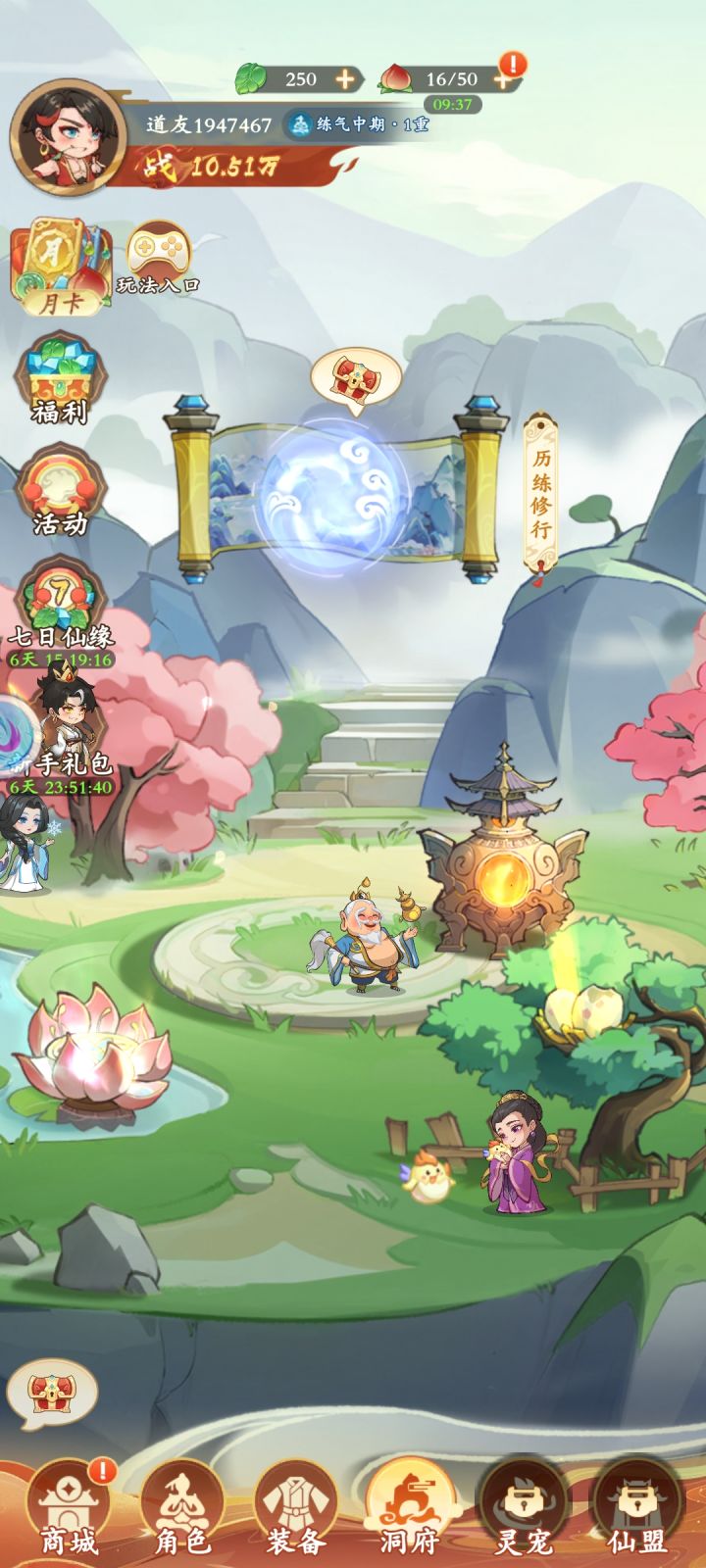 纯2D美术效果,品质同小游戏,界面布局常规,五页签UI很常见,功能入口和美术结合的方式也很中规中矩。角色造型没什么亮点,都是修仙类题材,没什么突出之处,还不如敌人留下的印象深。