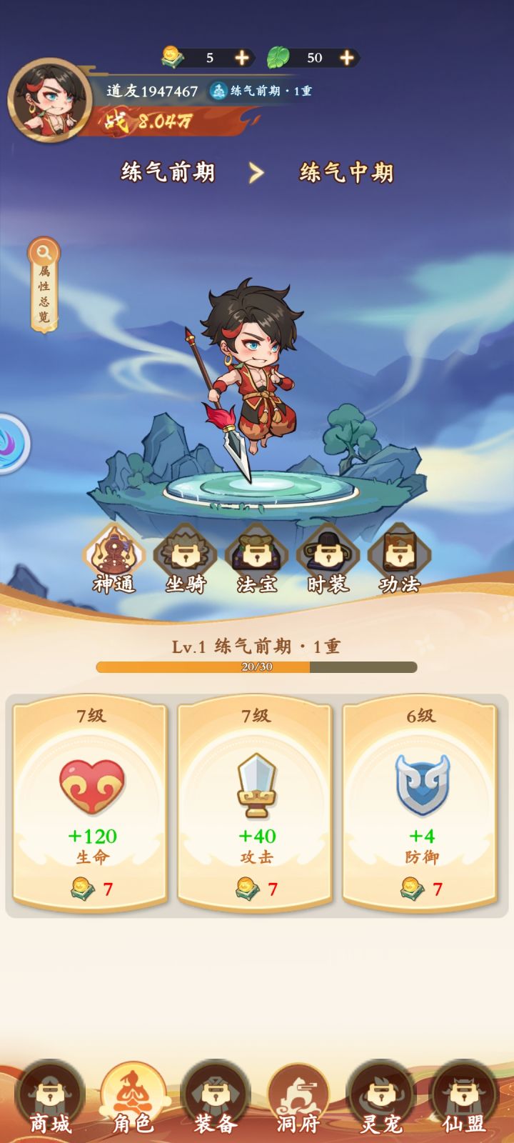 角色养成包含攻防血基础属性,和神通、坐骑、法宝、时装、功法等内容,根据修炼境界逐一解锁,前中后期养成设定,使目标感较强。