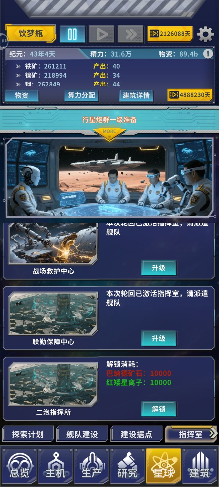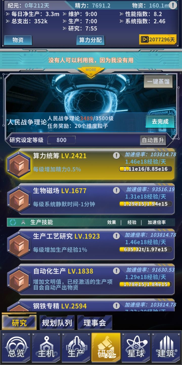 必知兑换码:showmetheshop开启商店(每周一刷新)showmethead开启广告(加速时间、精力双倍时间、基因)1.单局初始词条:新进入游戏选开局词条,可以多次退出重进进行有限刷新。词条中以提升蒸馏天数为最优,精力百分比为其次,研究效率再次,之后就是精力基数、物资、生产效率。但萌新开局,如果有100M的物资,选择或有奇效。2.算力分配:建议9小时维护,7小时生产,其余时间用于研究