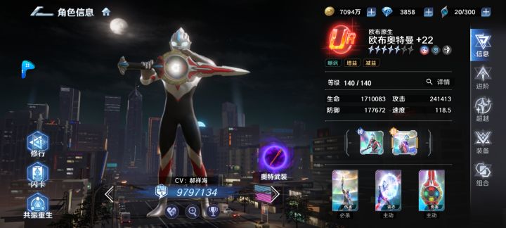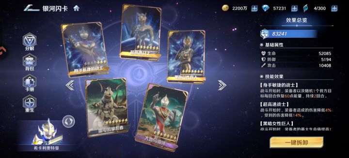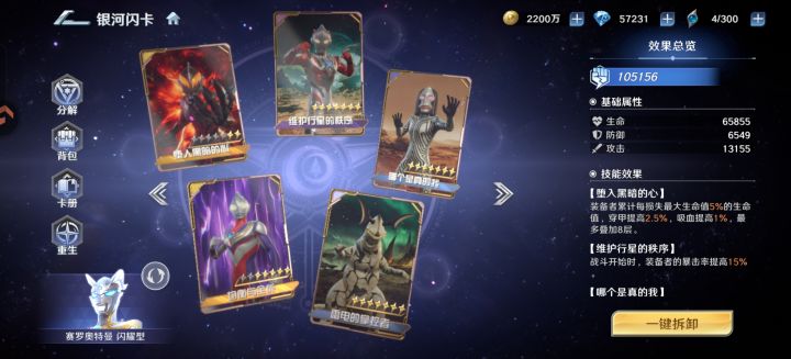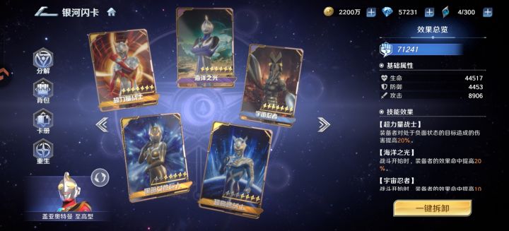 加上这个,满星后六边形战神,免控,减速,提速,护盾,反击,回能,降能,还有吸血越打越硬。武器和小技能都是被动技能,开局稳定buff加成。我已经幻想在后面几个吊的奥特曼都是被动指挥技能,回合开始就结束战斗了