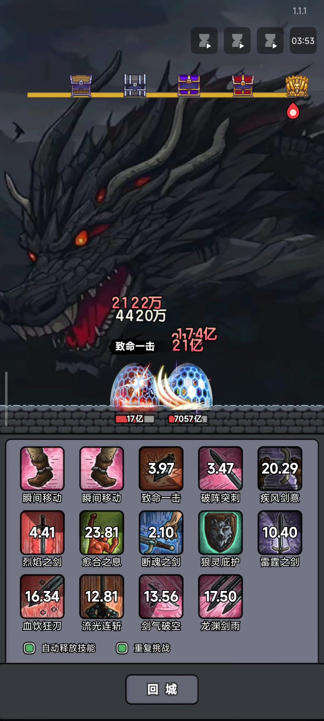 战斗:非数值碾压的情况下,比较看技能策略。怪物攻击前均有前摇,怪物头上还会冒出的技能名字,依据此来快速做出下一个动作(攻速不够的情况下,则可能会来不及)。计算战斗耗时和技能cd来使用技能,某些技能可以提前用,尽量做到打boss的时候是满状态的。主动技能简单讲解:核心攻击,虽然看起来攻击不太高,但冷却很短,累计起来打的伤害其实非常高,且可以尽情释放,不担心下一轮的CD.目前仅有的位移+攻