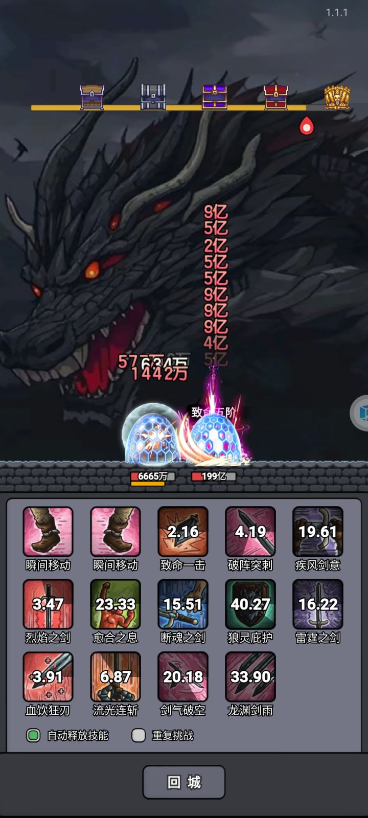 战斗:非数值碾压的情况下,比较看技能策略。怪物攻击前均有前摇,怪物头上还会冒出的技能名字,依据此来快速做出下一个动作(攻速不够的情况下,则可能会来不及)。计算战斗耗时和技能cd来使用技能,某些技能可以提前用,尽量做到打boss的时候是满状态的。主动技能简单讲解:核心攻击,虽然看起来攻击不太高,但冷却很短,累计起来打的伤害其实非常高,且可以尽情释放,不担心下一轮的CD.目前仅有的位移+攻