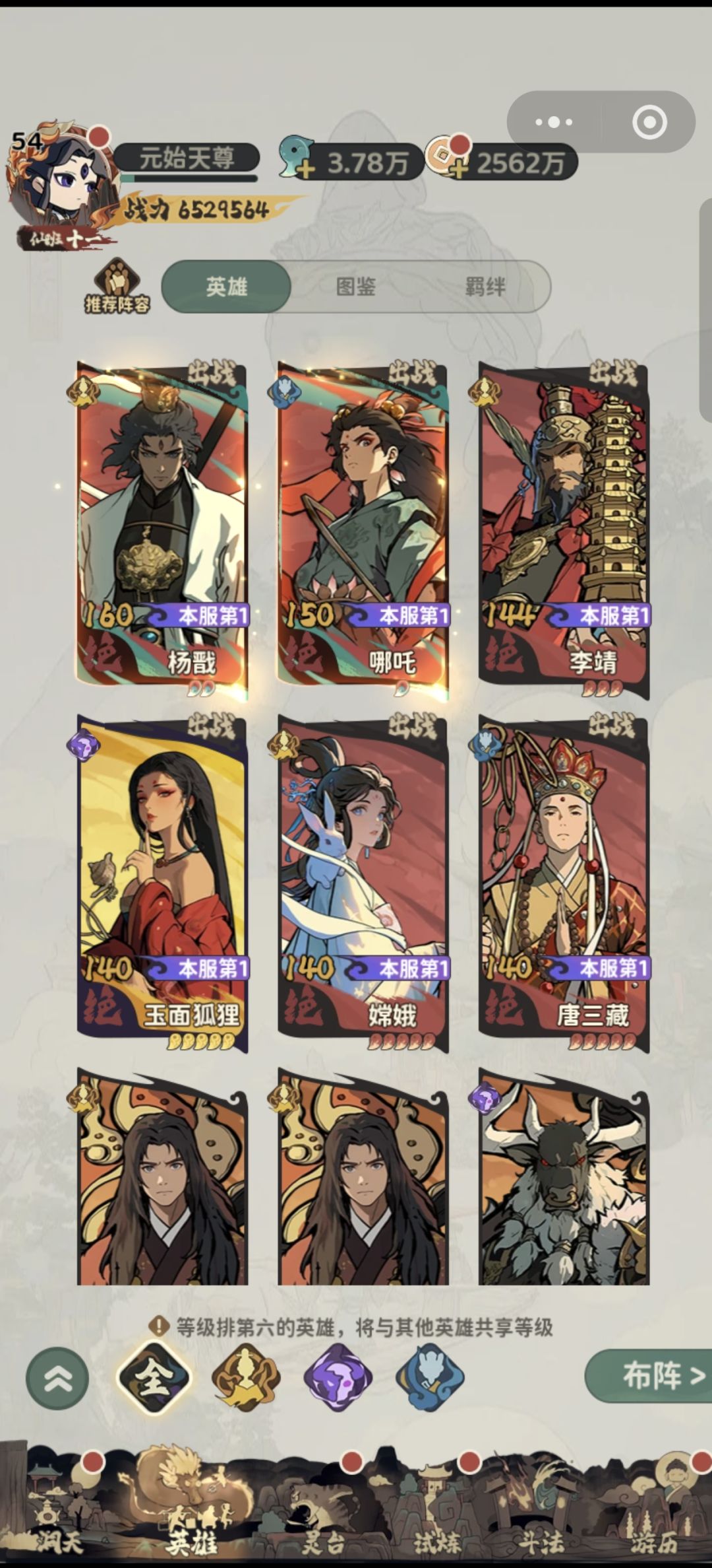 因为作者从白骨夫人开始微氪,错过了法宝活动,目前一直在补,法宝方面圣品法宝仅有生死簿和翻天印,难免有所疏漏大家多担待。目前看,法宝=灵侍>守护,大家在法宝活动的时候一定要珍惜。。下面根据自己微氪号对法宝 系统进行介绍,同时对一些热门法宝进行实战评测,有关圣品法宝的建议均参照本服20亿大佬的搭配交流后给出。 一、法宝系统概览 随着英雄星级提升,可佩戴法宝数量也增加,6星可以解锁两个法宝穿戴槽位,1